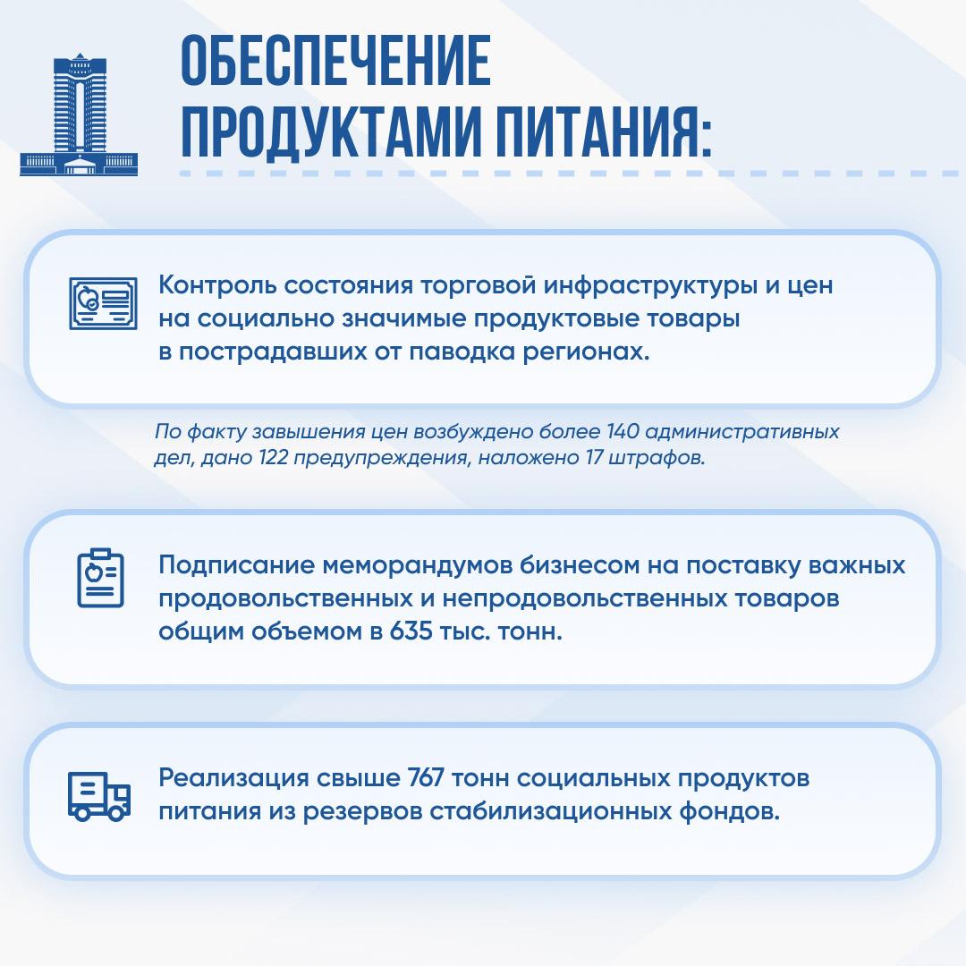 в 10 регионах, пострадавших от паводков, цены на социально значимые продукты питания находятся на ежедневном контроле. Созданы «горячие линии» для обращений граждан, открыты пункты общественного контроля. Субъекты бизнеса подписали меморандумы на поставку наиболее важных продовольственных и непродовольственных товаров общим объемом 635 тыс. тонн. Из резервов стабфондов реализовано около 767 тонн социальных продуктов питания. По факту завышения цен на СЗПТ в 10 пострадавших регионах возбуждено более 140 административных дел, дано 122 предупреждения, наложено 17 штрафов.