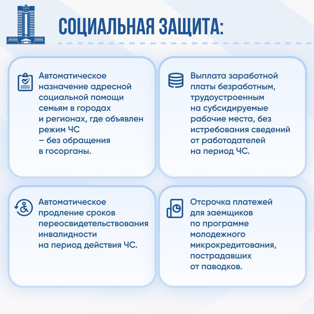 в городах и районах, где объявлен режим ЧС, осуществлено автоматическое назначение адресной социальной помощи 5 тыс. семей без их обращения в госорганы;