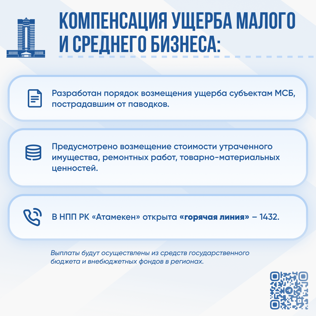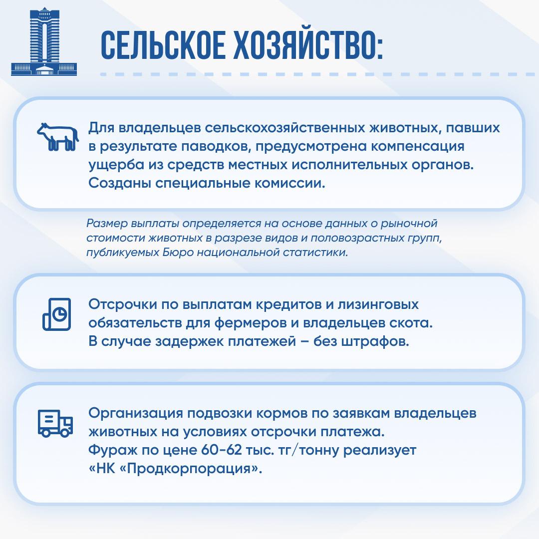всем пострадавшим индивидуальным предпринимателям, а также субъектам малого и среднего бизнеса, у которых из-за паводков нарушилась хозяйственная деятельность, будет предоставлена отсрочка платежей по кредитам с учетом поданного ими заявления (необходимо обратиться в акимат или в банк напрямую);