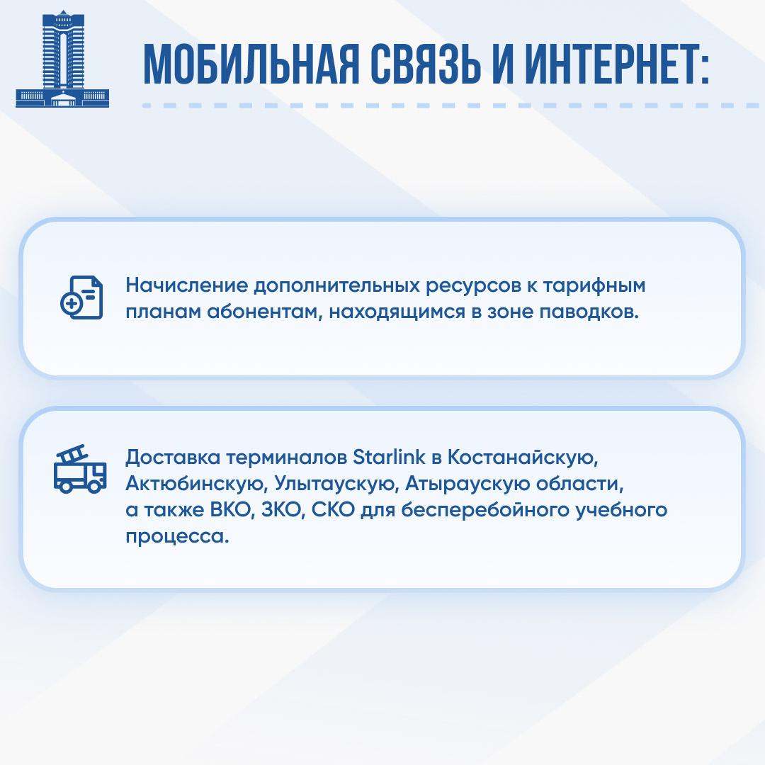 операторами сотовой связи были начислены дополнительные ресурсы к тарифным планам (40-50 мин, 40-50 СМС и 8-10 Гб на 7 дней) абонентам, находящимся в зоне паводков. Также для обеспечения бесперебойного учебного процесса отправлены комплекты терминалов Starlink в Костанайскую, Актюбинскую, Атыраускую, Восточно-Казахстанскую, Западно-Казахстанскую, Северо-Казахстанскую области и Ұлытау.