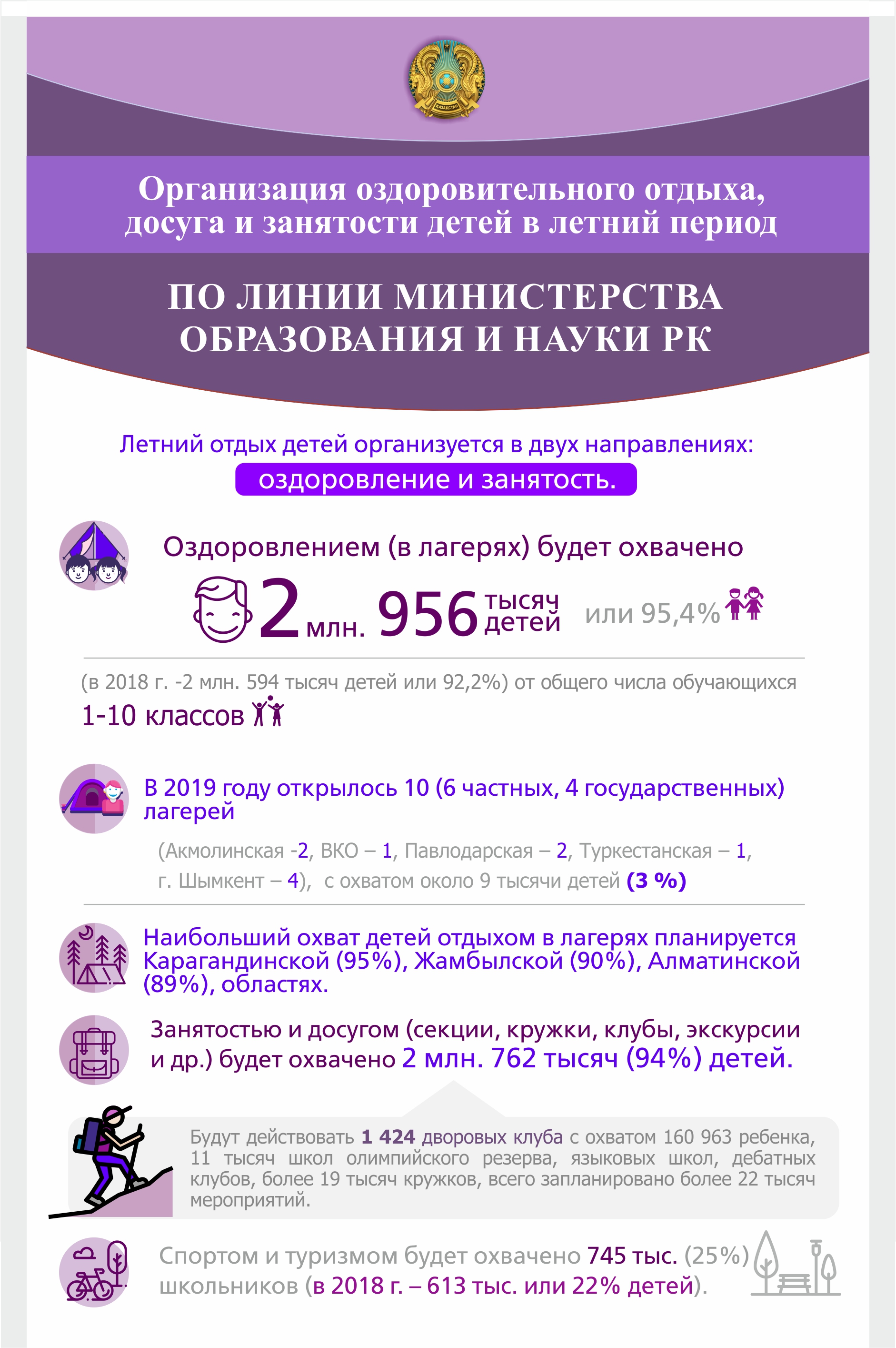 Таким образом, Правительством РК ведется системная работа по обеспечению детей качественным и безопасным отдыхом и досугом, в особенности в летний период. Кроме того, для желающих созданы все условия по частичной занятости. Данные меры позволяют подрастающему поколению не только укрепить здоровье, но и развить личностные и коммуникативные навыки. Вводимые с текущего года летние школы на базе местных вузов будут обучать детей по таким направлениям, как изучение языков, ИТ-технологии и робототехника, история, филология, биотехнологии, предпринимательство и ведение бизнеса, правоведение, критическое мышление и т. д.