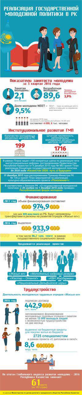 Проводимая работа позволила Казахстану занять 61-ю позицию в Глобальном индексе развития молодежи – Global Youth Development Index 2016, в котором оценивались 183 страны.