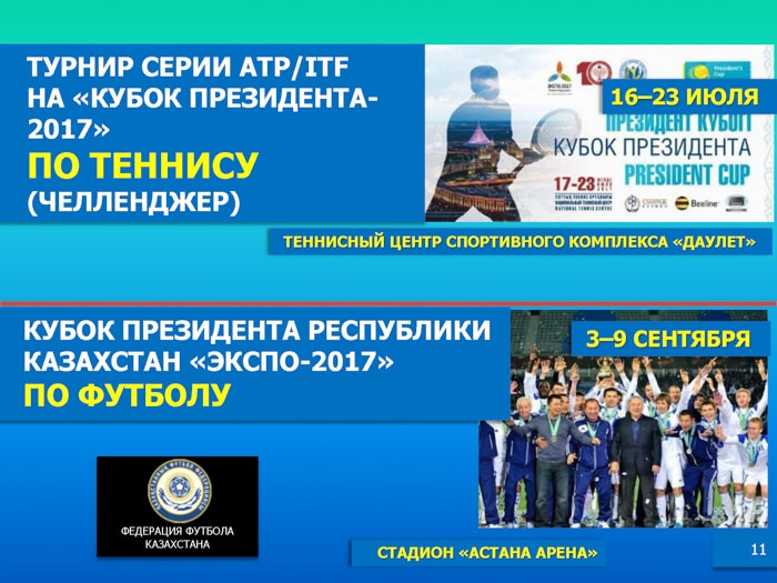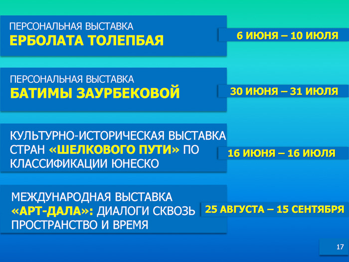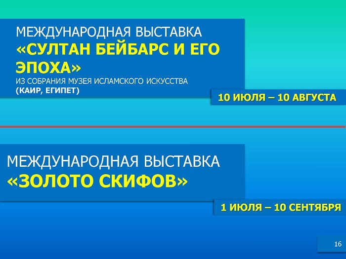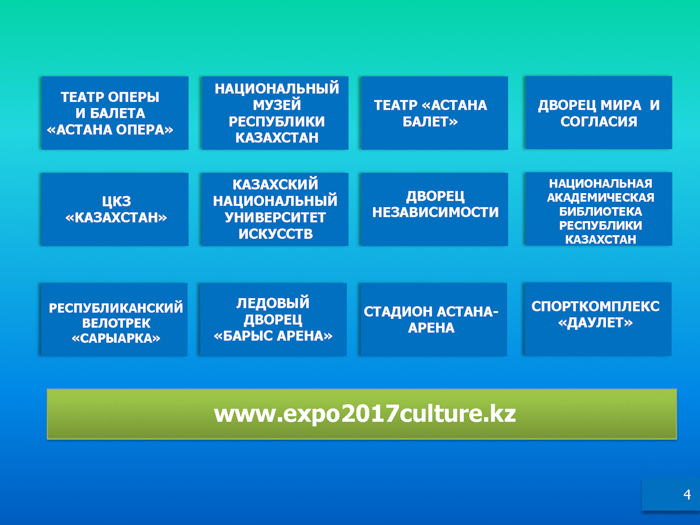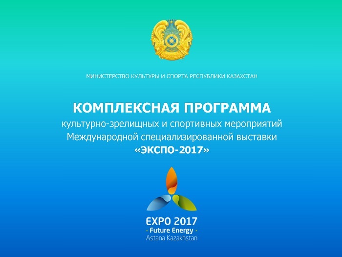 На заседании Правительства РК 2 мая текущего года под председательством Премьер-Министра РК Бакытжана Сагинтаева была представлена Комплексная программа культурных и спортивных мероприятий в рамках выставки ЭКСПО-2017.