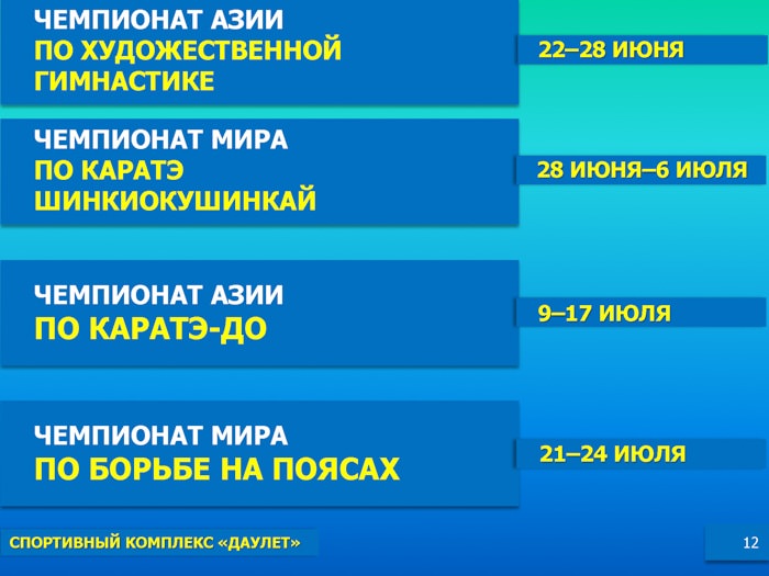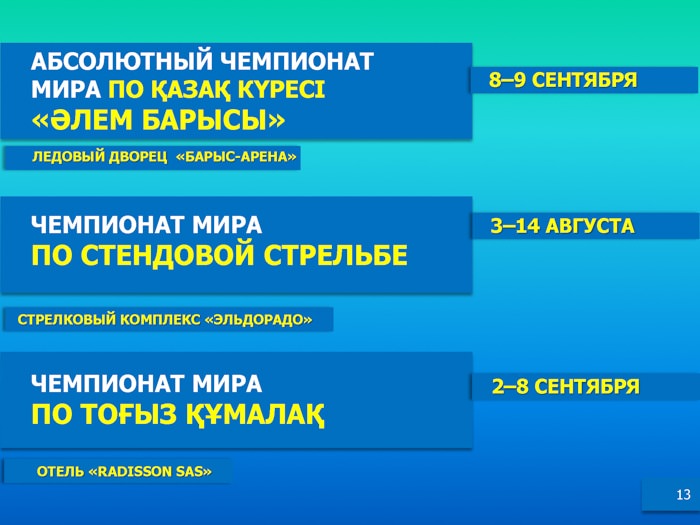Как сообщалось, в период Международной выставки запланировано 14 крупных спортивных мероприятий, в том числе 6 чемпионатов мира, 2 чемпионата Азии, 3 международных соревнования, 2 Кубка Президента РК и юбилейная 55-ая ежегодная конвенция Всемирного боксерского совета.