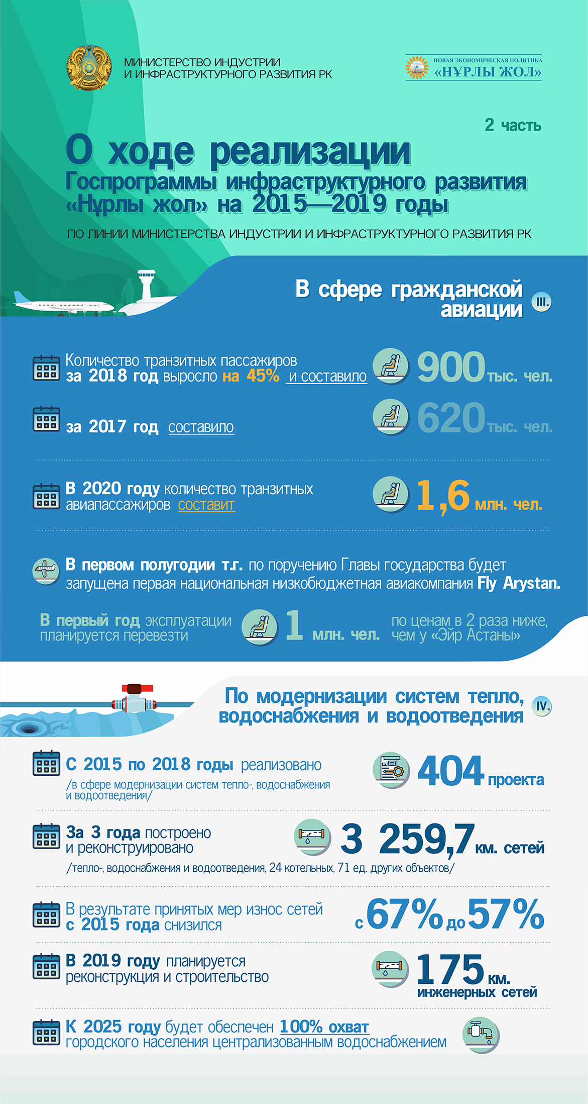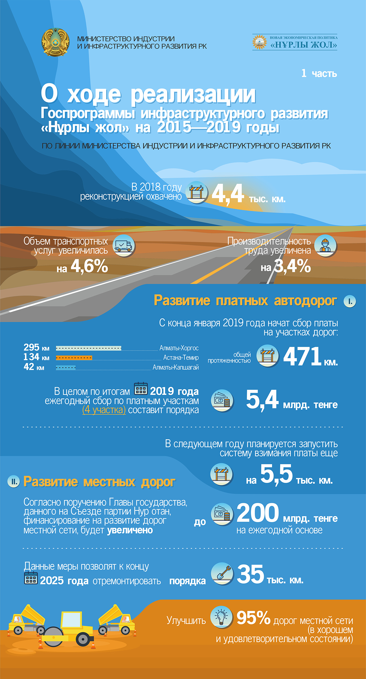 Как сообщил Р. Даленов, в рамках развития транспортной инфраструктуры в целом строительством и реконструкцией было охвачено 4,6 тыс. км и по итогам 2018 года открыто движение на 528 км. Выполнен капитальный ремонт 928 км ЖД путей. Велась реконструкция взлетно-посадочной полосы (ВПП) в Костанайской области и завершена реконструкция полосы в городе Семей. В 2018 году построено 172,7 км инженерных сетей — износ сетей снизился с 60% до 57%. В целом, реализация программы внесла вклад в прирост ВВП и позволила в 2018 году создать более 86 тыс. рабочих мест при плане 55 тыс.