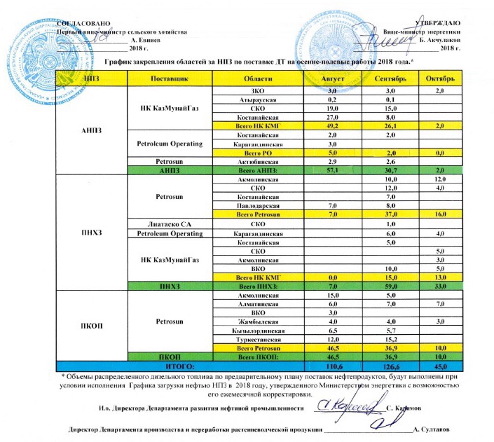 Кроме того, в целях обеспечения своевременного проведения полевых работ 2018 г. Министерством энергетики совместно с Министерством сельского хозяйства разработаны «Графики закрепления областей за НПЗ по поставке дизельного топлива на полевые работы 2018 г.», в рамках которого общая заявка для СХТП удовлетворена в полном объеме и утверждена в объеме 769,4 тыс. т. Так, дизтопливо фермерам поставляют весной на посевную и осенью при уборке урожая. В начале года сельхозтоваропроизводителям выделили 375 тысяч т дизтоплива. На осенние поставки заявили 394,4 тысячи т.