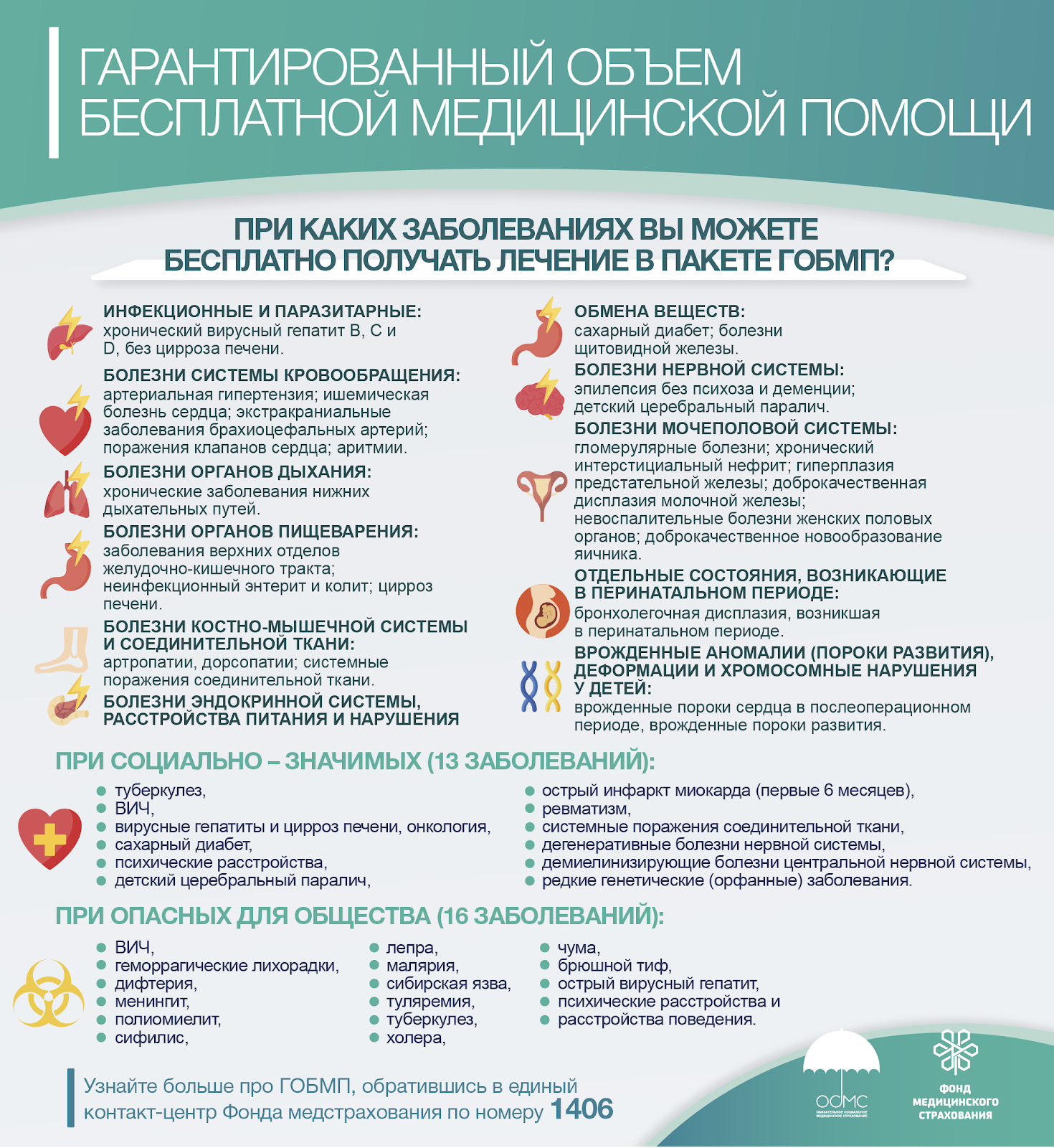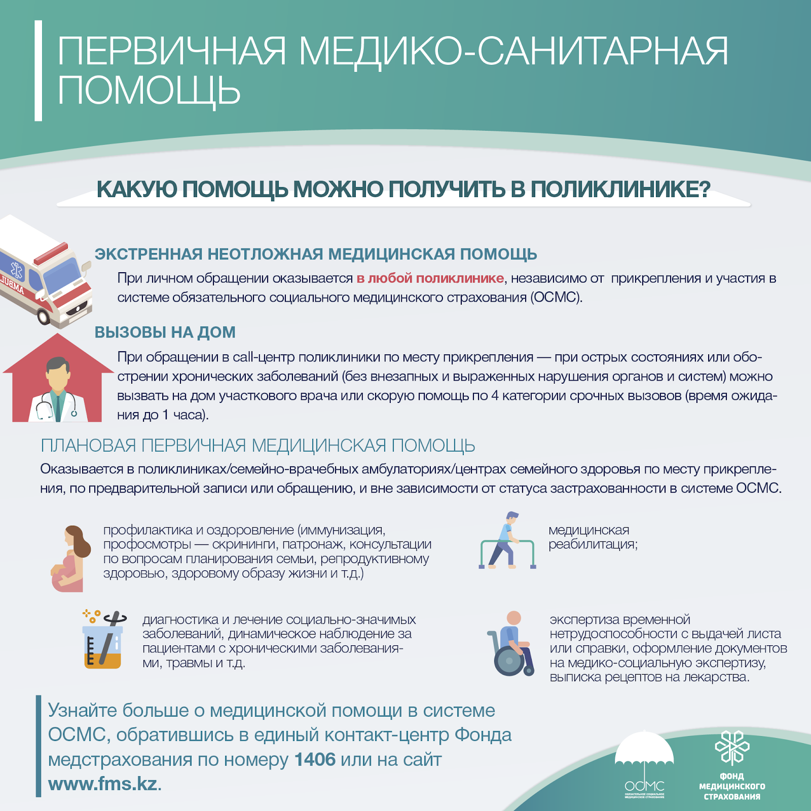 Если участковый врач/терапевт установил заболевание, которое относится к социально-значимым, основным хроническим или опасным, такому пациенту будет оказан полный спектр медуслуг, включая консультации узкопрофильных специалистов, все необходимые диагностические обследования, лечение в дневном и круглосуточном стационарах, медицинскую реабилитацию, паллиативную помощь (поддерживающую терапию для пациентов с тяжелыми заболеваниями), вне зависимости от его участия в системе ОСМС. Это такие заболевания, как онкология, сахарный диабет, артериальная гипертензия, ишемическая болезнь сердца, ВИЧ, гепатит, туберкулез и т.д.