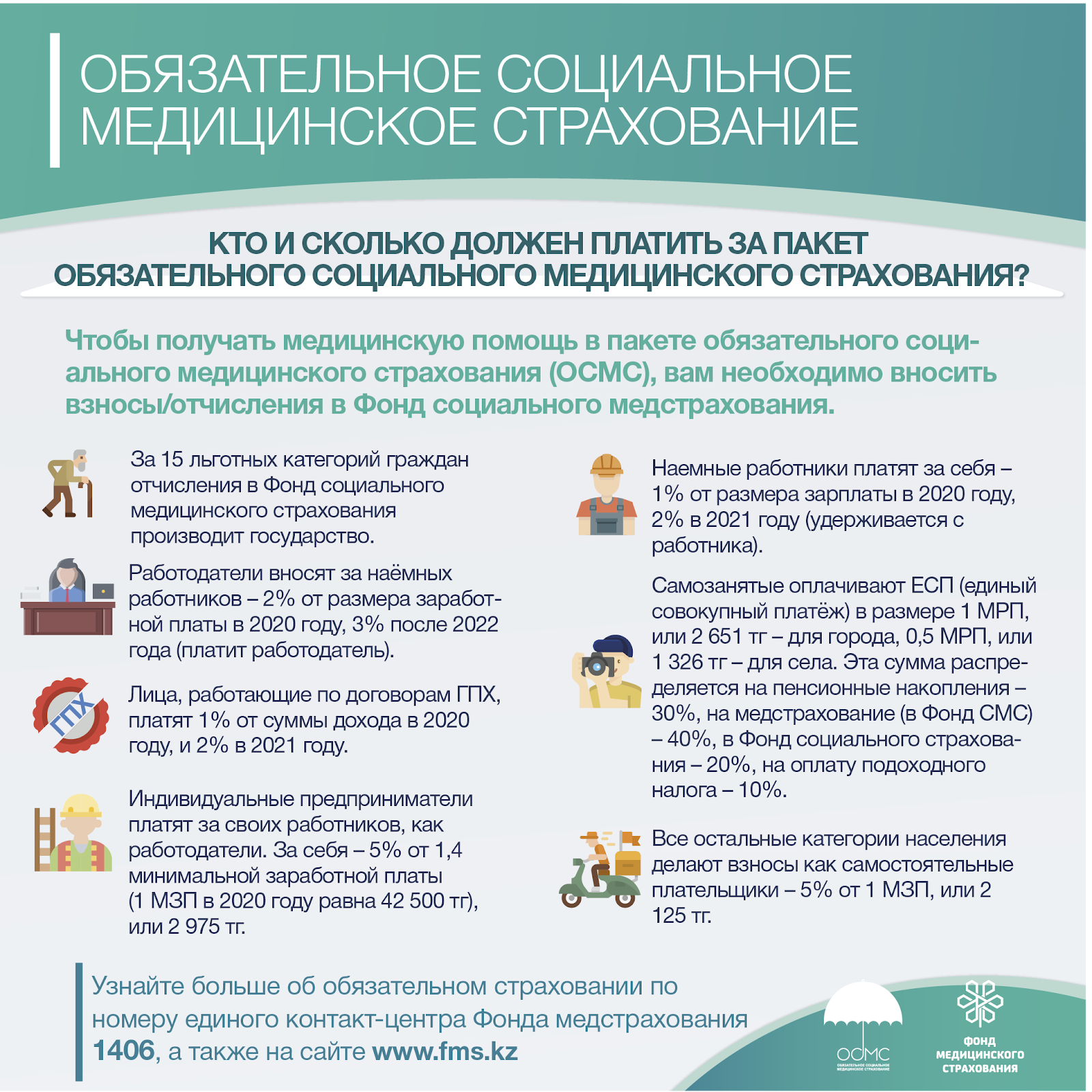 С этого года работодатели платят за наемных работников 2% от заработной платы, и будут платить 3% после 2022 года. Помимо этого, с зарплаты работника удерживается 1%, и будет удерживаться 2% с 2021 года. Наемные работники по договорам ГПХ платят за себя так же, как и работники, 1% от дохода в этом году и 2% с 2021 года. Индивидуальные предприниматели платят за своих работников, как работодатели. За себя — 5% от 1,4 минимальной заработной платы (1 МЗП в 2020 году равен 42 500 тенге), или 2 975 тенге. Самозанятые оплачивают единый совокупный платёж в размере 1 МРП, или 2 651 тенге – для города, 0,5 МРП, или 1 326 тенге — для села. Эта сумма распределяется на пенсионные накопления — 30%, на медстрахование (в Фонд СМС) — 40%, в фонд социального страхования — 20%, на оплату подоходного налога — 10%. Все остальные категории населения оплачивают взносы, как самостоятельные плательщики — 5% от 1 МЗП, или 2 125 тенге.