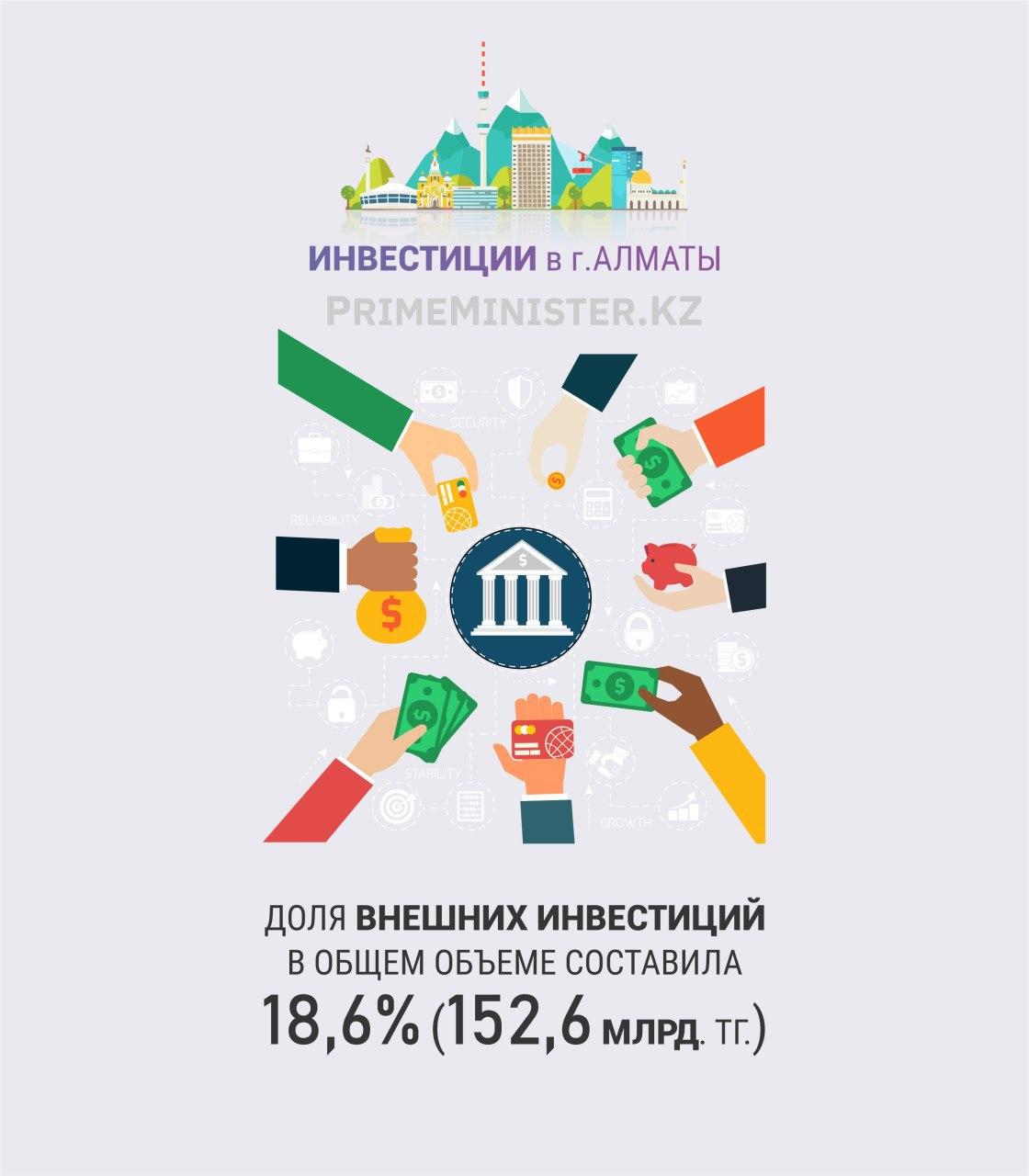 По данным акимата г. Алматы, объем инвестиций в основной капитал за январь-декабрь 2019 года составил 821 млрд тенге с ростом на 8,3%.