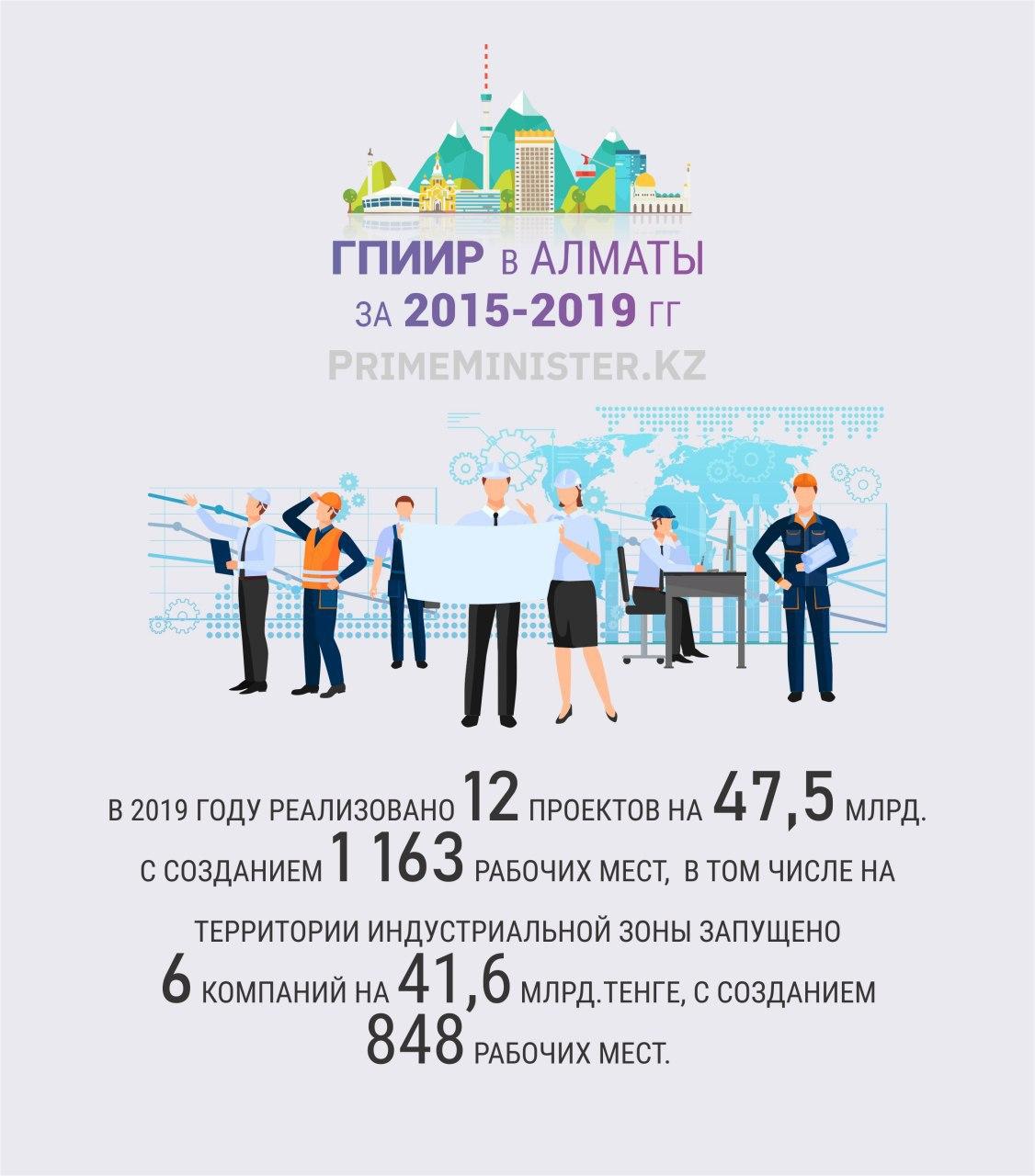В 2019 году реализовано 12 проектов на 47,5 млрд с созданием 1 163 рабочих мест, в том числе на территории индустриальной зоны запущено 6 компаний на 41,6 млрд тенге с созданием 848 рабочих мест.