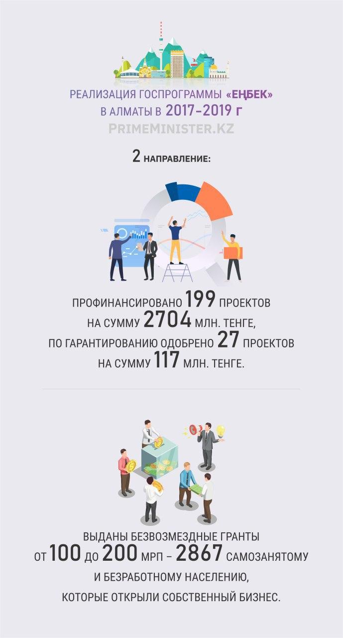 В рамках Государственной Программы развития продуктивной занятости и массового предпринимательства на 2017-2021 годы «Еңбек» профинансировано 199 проектов на 2 704 млн тенге.