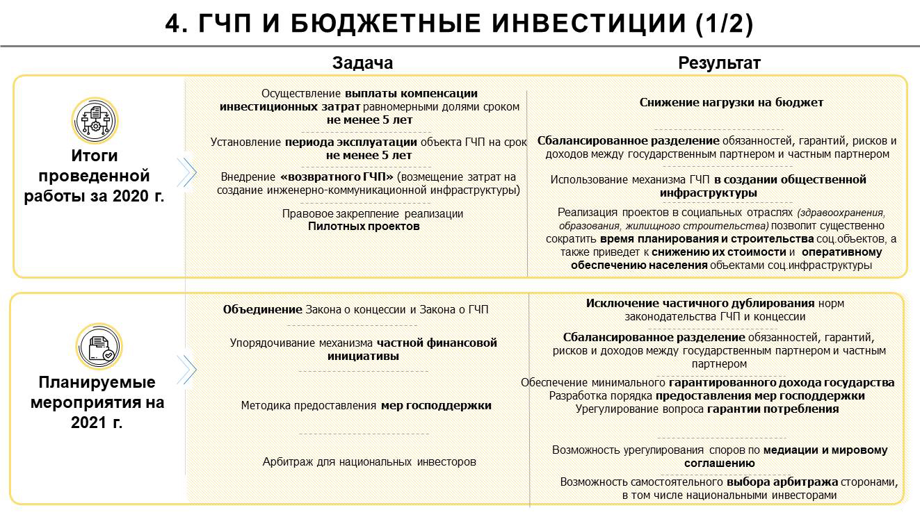 В сфере бюджетных инвестиций непрерывно проводится работа по совершенствованию законодательства. Так, в рамках Закона от 25 декабря 2020 года «О внесении изменений и дополнений в Бюджетный кодекс» принята норма, позволяющая реализовать пилотные проекты по новой схеме в г. Нур-Султане, Жамбылской и Северо-Казахстанской областях. Это позволит сократить время планирования и строительства социальных объектов и снизить их стоимость, что приведет к экономии средств, которые могут быть возвращены в бюджет либо доиспользованы в рамках новых государственных инвестиционных проектов.