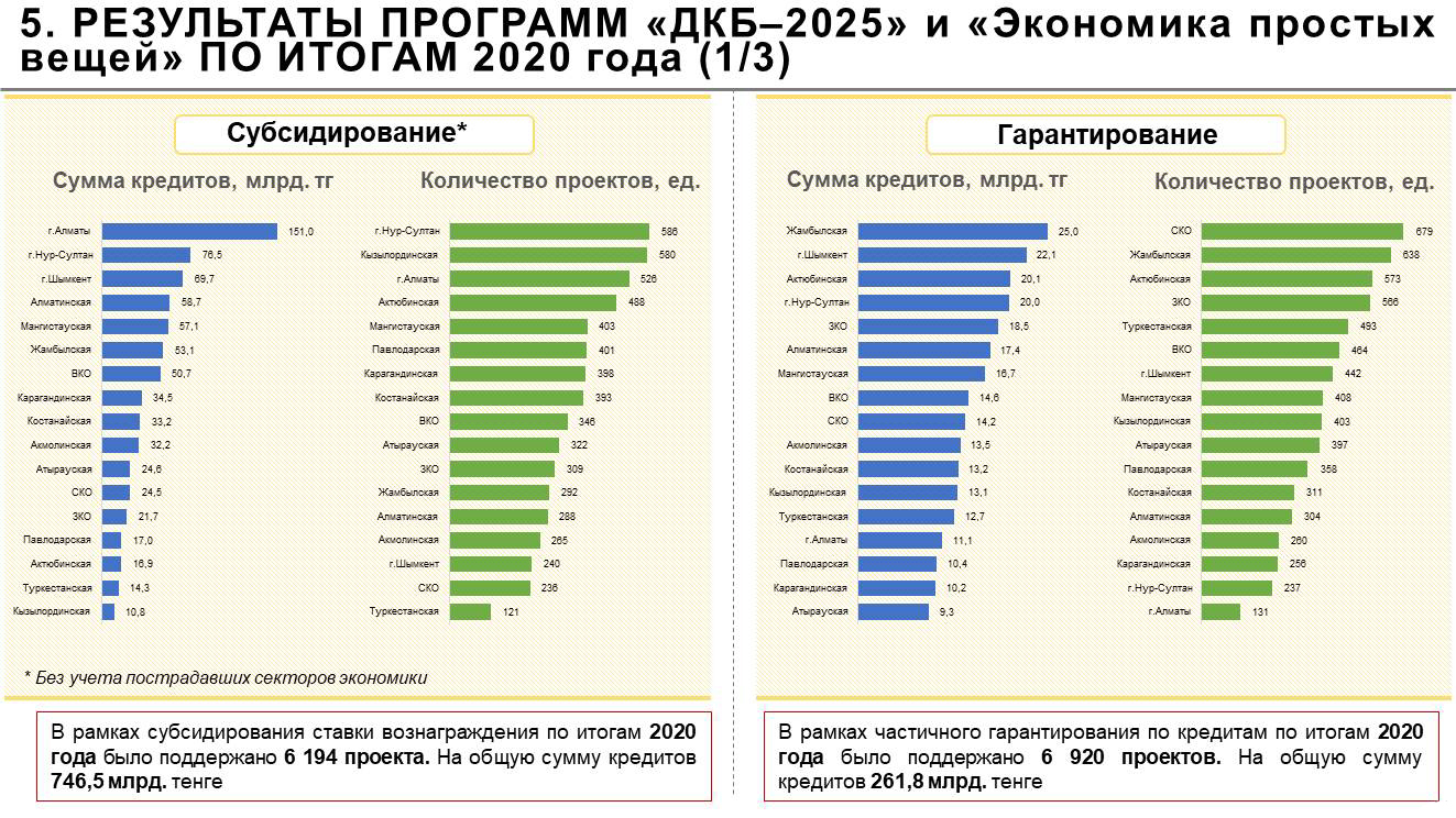 По итогам 2020 года в рамках программ «Дорожная карта бизнеса 2025» и «Экономика простых вещей» было просубсидировано 6 194 проектов на общую сумму кредитов 746,5 млрд тг. Предоставлено гарантий по 6 920 проектам на сумму кредитов 261,8 млрд тг.