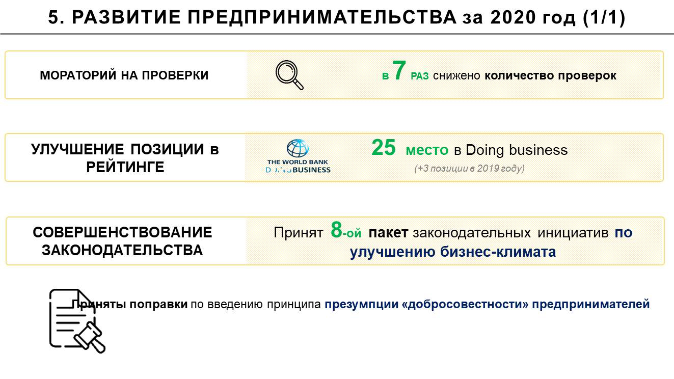 В результате введенного в 2020 году моратория количество проверок малого и микро- бизнеса снизилось в 4,6 раза (со 128,4 тыс. до 27,4 тыс.). Проверки в отношении малого и микро- бизнеса сократились в 7 раз (с 66,2 тыс. до 9,3 тыс.). В целях защиты прав предпринимателей от незаконных действий приняты поправки по введению принципа презумпции «добросовестности» предпринимателей.