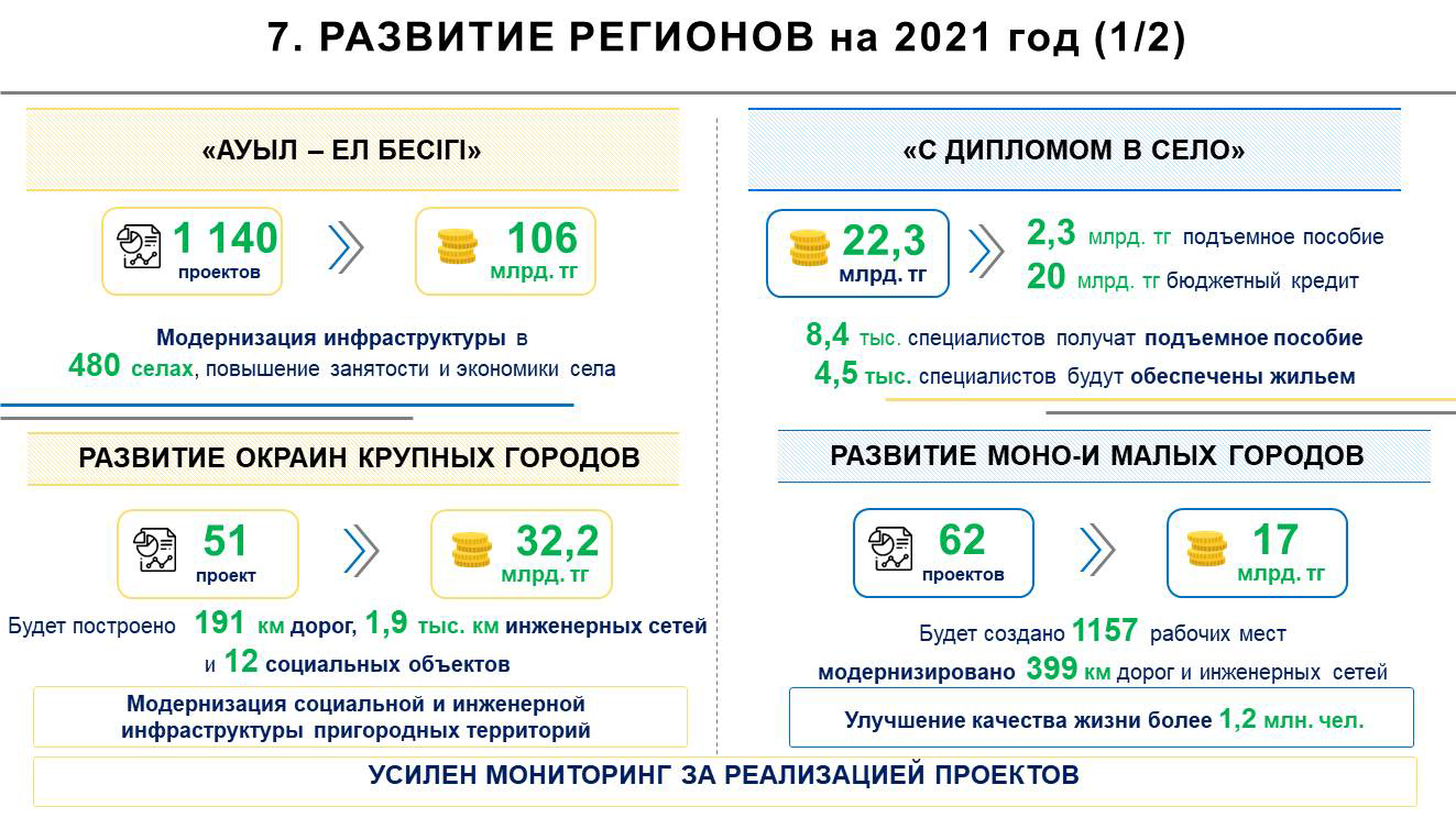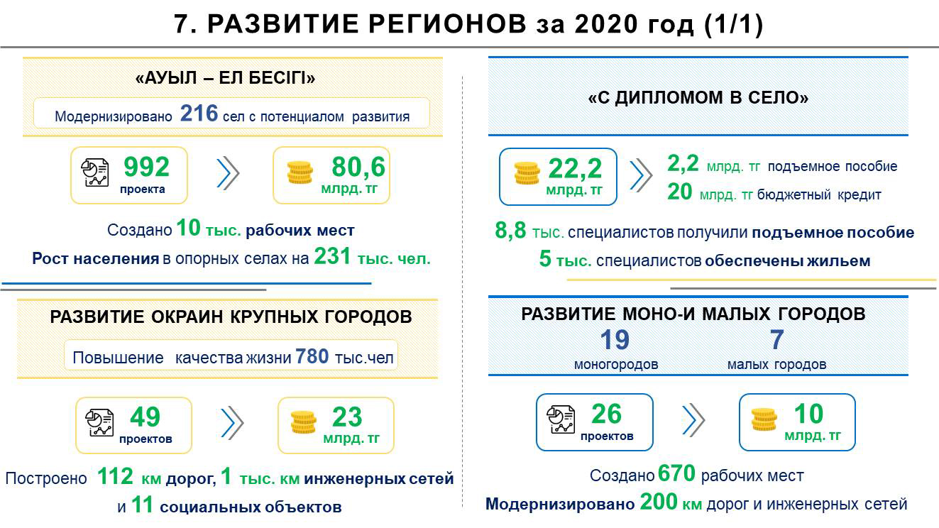 В результате построено и отремонтировано 1,9 тыс. км дорог и около 1 тыс. км инженерных сетей, 188 школ и детсадов, 170 объектов культуры и спорта, 55 объектов здравоохранения (поликлиники, ВА, ФАП и т.д.). Создано порядка 16 тыс. рабочих мест. Для повышения кадрового потенциала в селах по проекту «С дипломом в село» в 2020 году 5 тыс. специалистов получили бюджетный кредит на жилье на сумму 20 млрд. тенге и 8,8 тыс. специалистов получили подъемные пособия на сумму 2,2 млрд тг. В результате улучшения условий жизни в опорных селах (1 173 села) наблюдается рост численности населения на 231 тыс. человек (с 6 621,3 до 6 852,7 тыс. чел.).