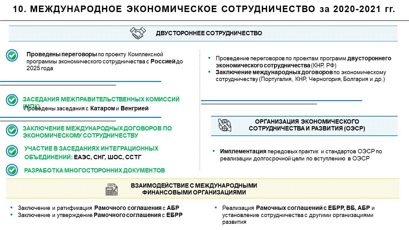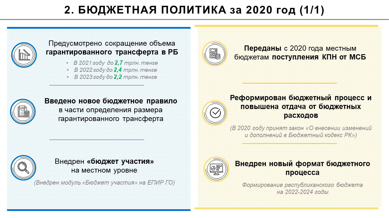 Так, в 2020 году были приняты срочные меры по поддержке населения и бизнеса, оперативные меры по сохранению социально-экономической устойчивости, Комплексный план по восстановлению экономического роста.