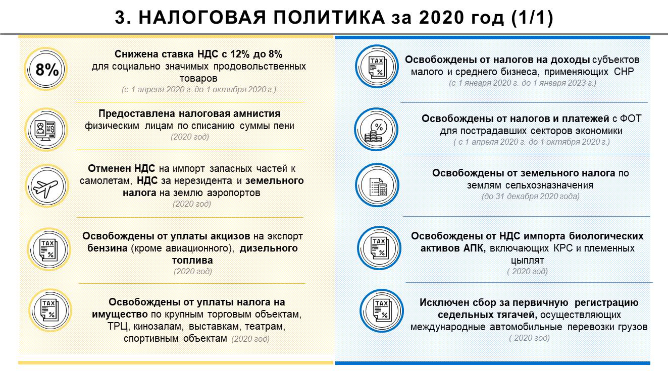 В чрезвычайных условиях 2020 года приняты беспрецедентные меры по налоговому и финансовому стимулированию, снижению административной нагрузки на бизнес. В частности, до октября 2020 года были обнулены ставки по налогам, социальным платежам с фонда оплаты труда для пострадавших секторов экономики. Снижена ставка НДС до 8% для социально значимых продовольственных товаров.