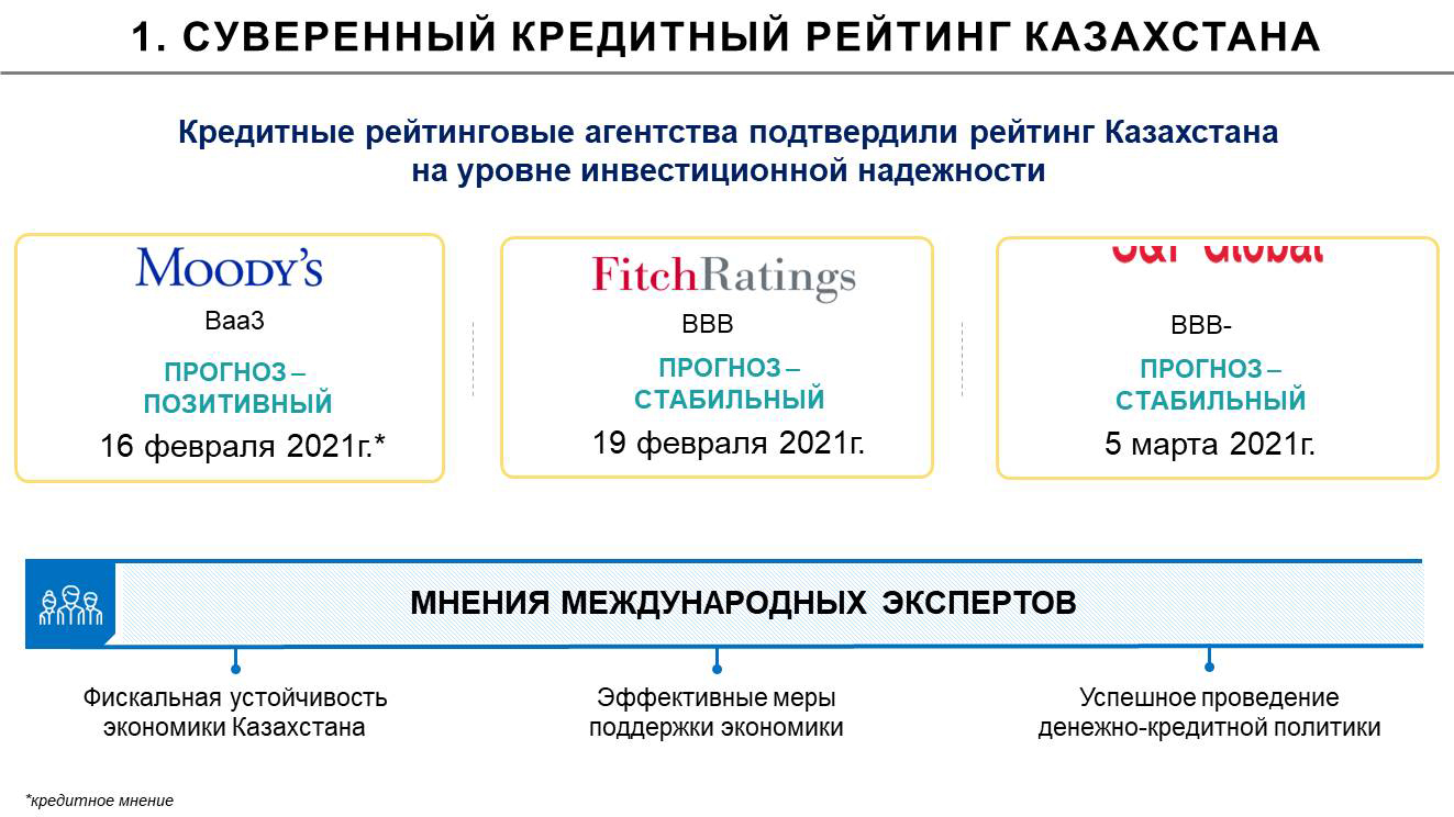 Ведущие рейтинговые агентства Moody’s, Fitch и Standard&Poor’s подтвердили допандемические инвестиционные рейтинги казахстанской экономики и повысили ожидания касательно темпов роста национального производства в т.г.