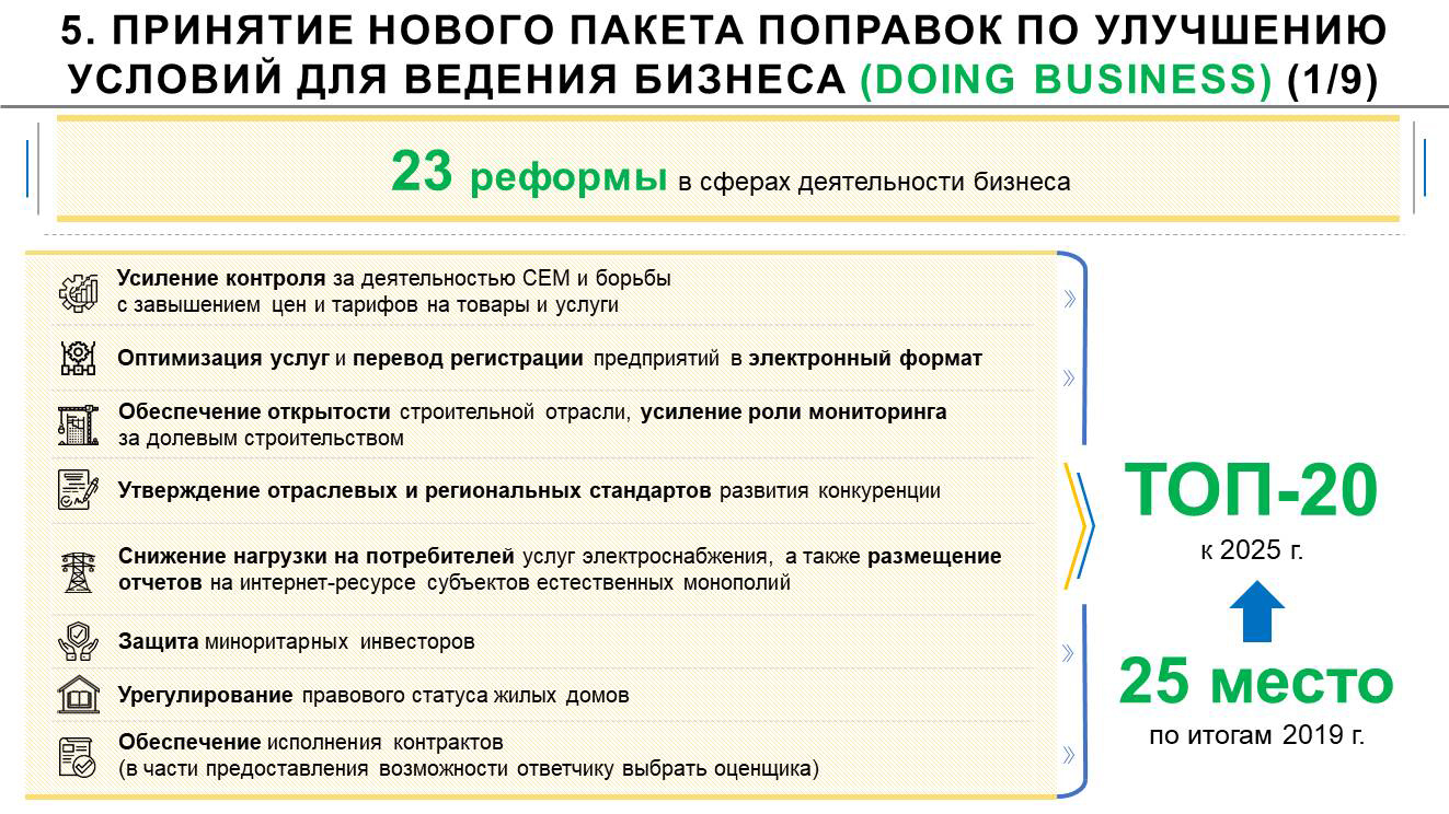 С 2014 года по 2020 годы проведены кардинальные реформы по улучшению позиций страны в рейтинге «Doing Business». В результате за 7 лет позиция страны поднялась с 76 до 25 места по итогам 2019 года. Амбициозной целью Правительства является вхождение в 20 лучших стран в рейтинге Doing Business.