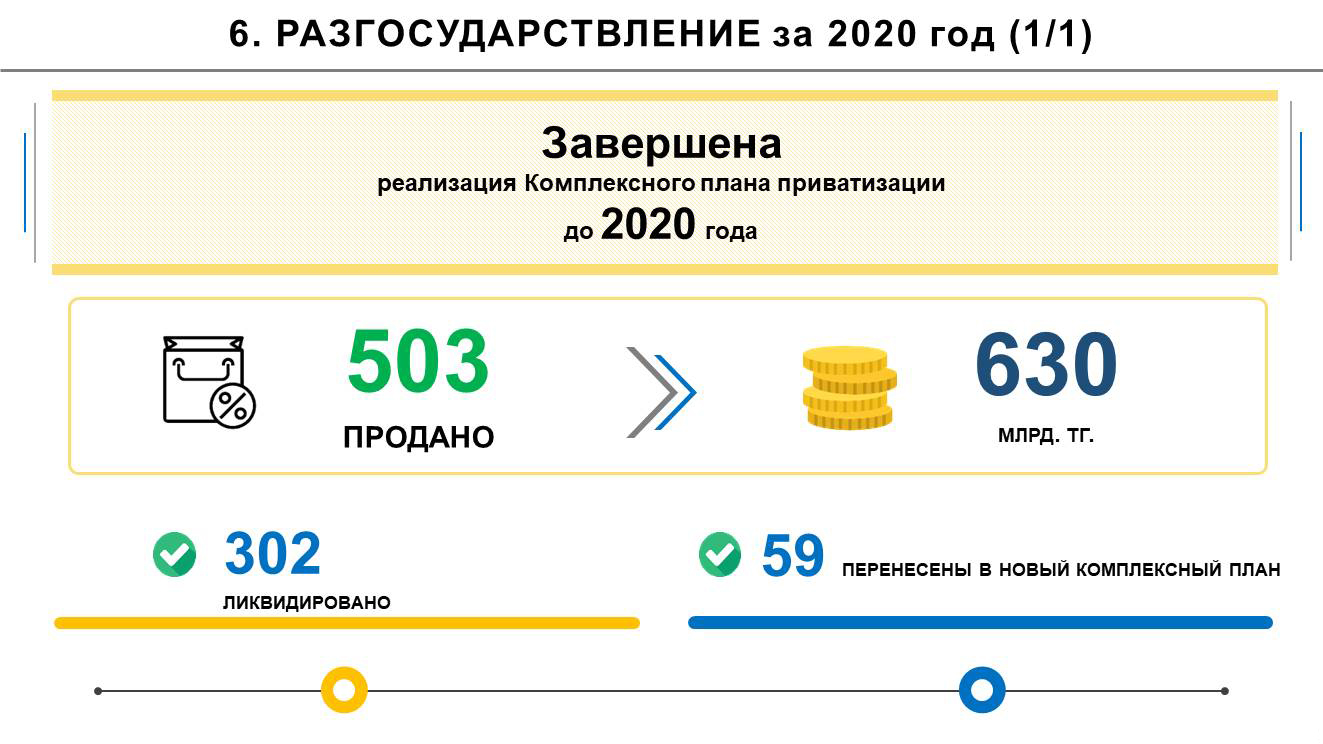 В рамках работы по снижению доли государства в конкурентных секторах экономики завершена реализация Комплексного плана приватизации до 2020 года. Продано 503 объекта на сумму 630 млрд тг. Реорганизованы и ликвидированы 302 объекта. Перенесены в новый комплексный план – 59. В основном это объекты коммунальной собственности. В целях дальнейшего сокращения участия государства в экономике страны принят новый пятилетний Комплексный план приватизации до 2025 года. В новый план вошло 736 организаций.