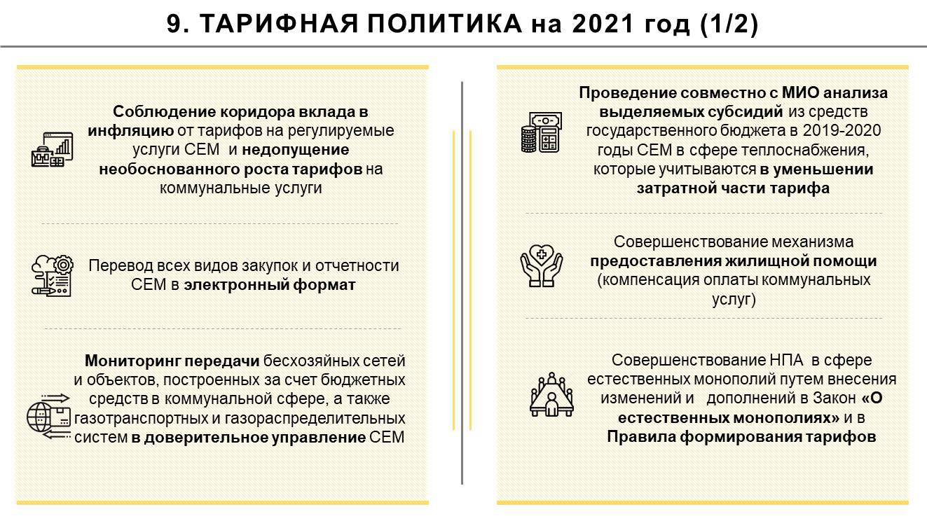 В 2020 году на период действия ЧП и карантина тарифы были снижены в среднем на 7,4% (в т.ч. снижение на услуги водоснабжения на 8%, водоотведения на 9,3% и теплоснабжения на 7,6%, электроснабжение на 5%). В результате совокупный вклад в инфляцию от тарифов на регулируемые услуги на 2020 год составил 0,11%. Общая экономия для населения составила порядка 1 млрд тг за один месяц.