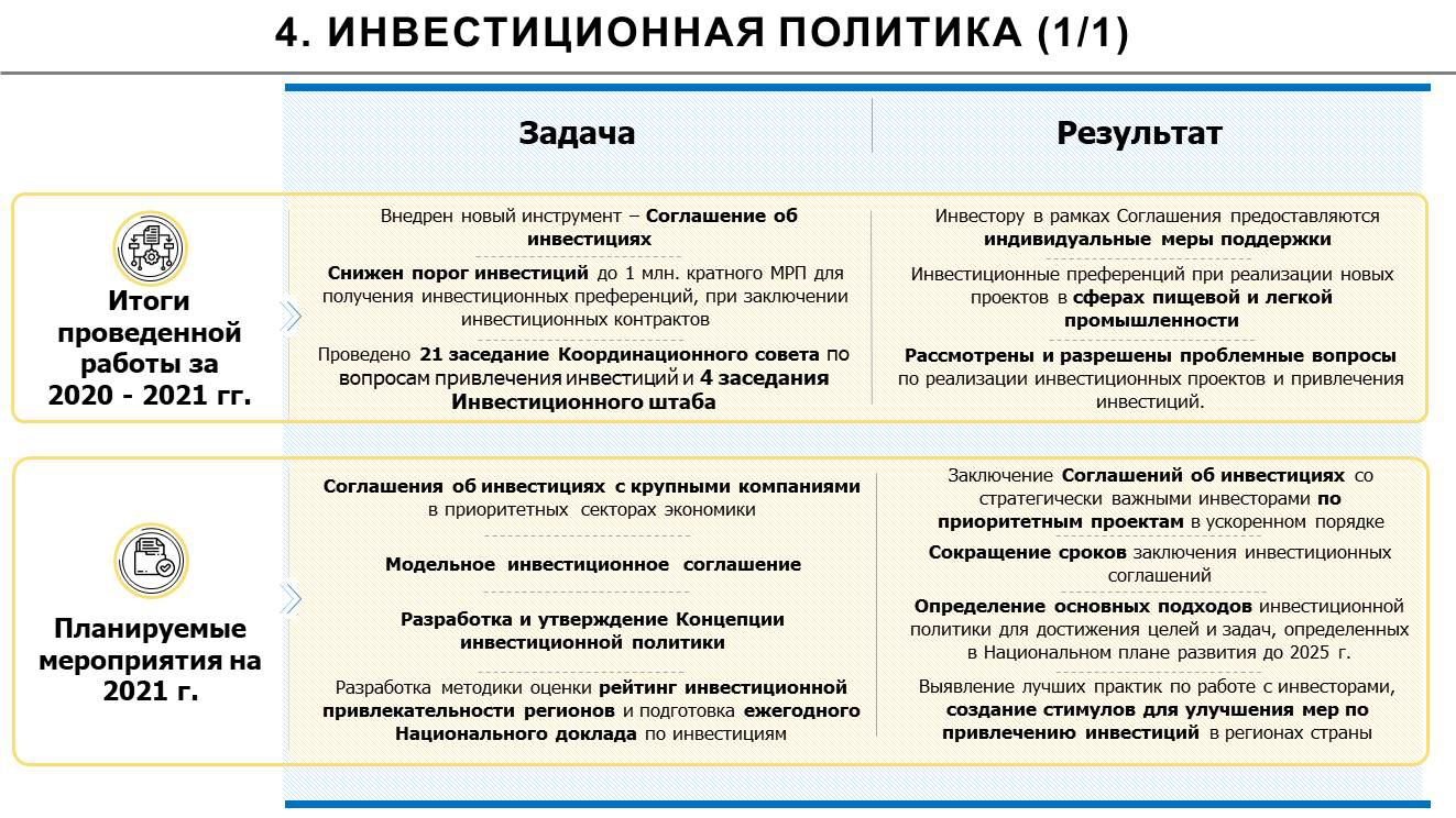 Внедрен новый инструмент — Соглашение об инвестициях, которое будет заключаться между государством и инвесторами в целях фиксации договоренностей.