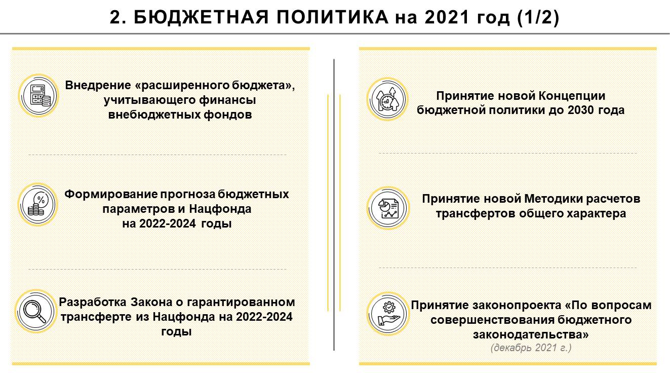 Подготовлены и внесены предложения по внедрению «расширенного бюджета», учитывающего финансы внебюджетных фондов (ГФСС, ФСМС). Будет сформирован прогноз бюджетных параметров и Нацфонда на 2022-2024 годы с разработкой соответствующего закона.