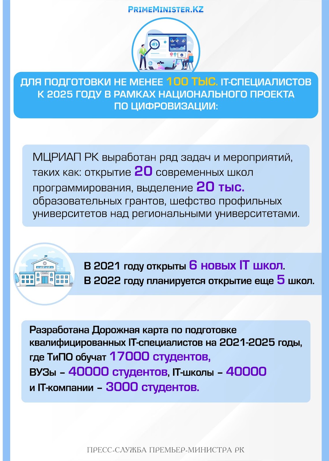 В рамках Национального проекта по цифровизации Главой государства была поставлена задача по подготовке не менее 100 тыс. высококлассных IT-специалистов к 2025 году.
