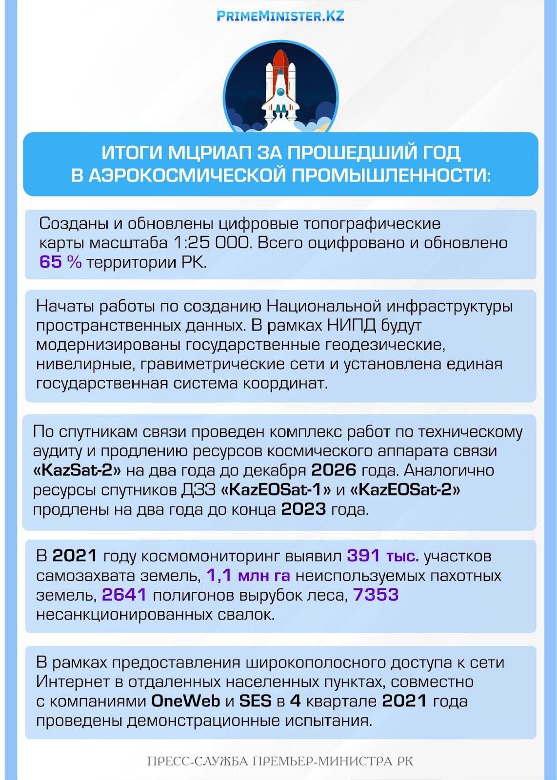По спутникам связи проведен комплекс работ по техническому аудиту и продлению ресурсов космического аппарата связи «KazSat-2» на два года до декабря 2026 года. Аналогично ресурсы спутников ДЗЗ «KazEOSat-1» и «KazEOSat-2» продлены на два года до конца 2023 года. Ресурсы космических аппаратов будут подтверждаться ежегодно и при необходимости продлеваться дальше.