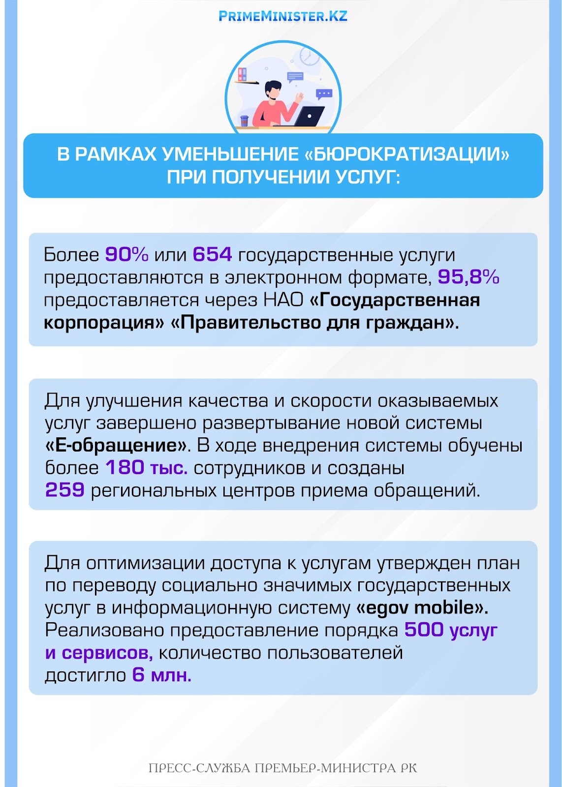 В настоящее время в обновленном реестре 692 государственных услуг, из них более 90% или 654 предоставляются в электронном формате, 95,8% предоставляется через Государственную корпорацию· НАО «Государственная корпорация» «Правительство для граждан».