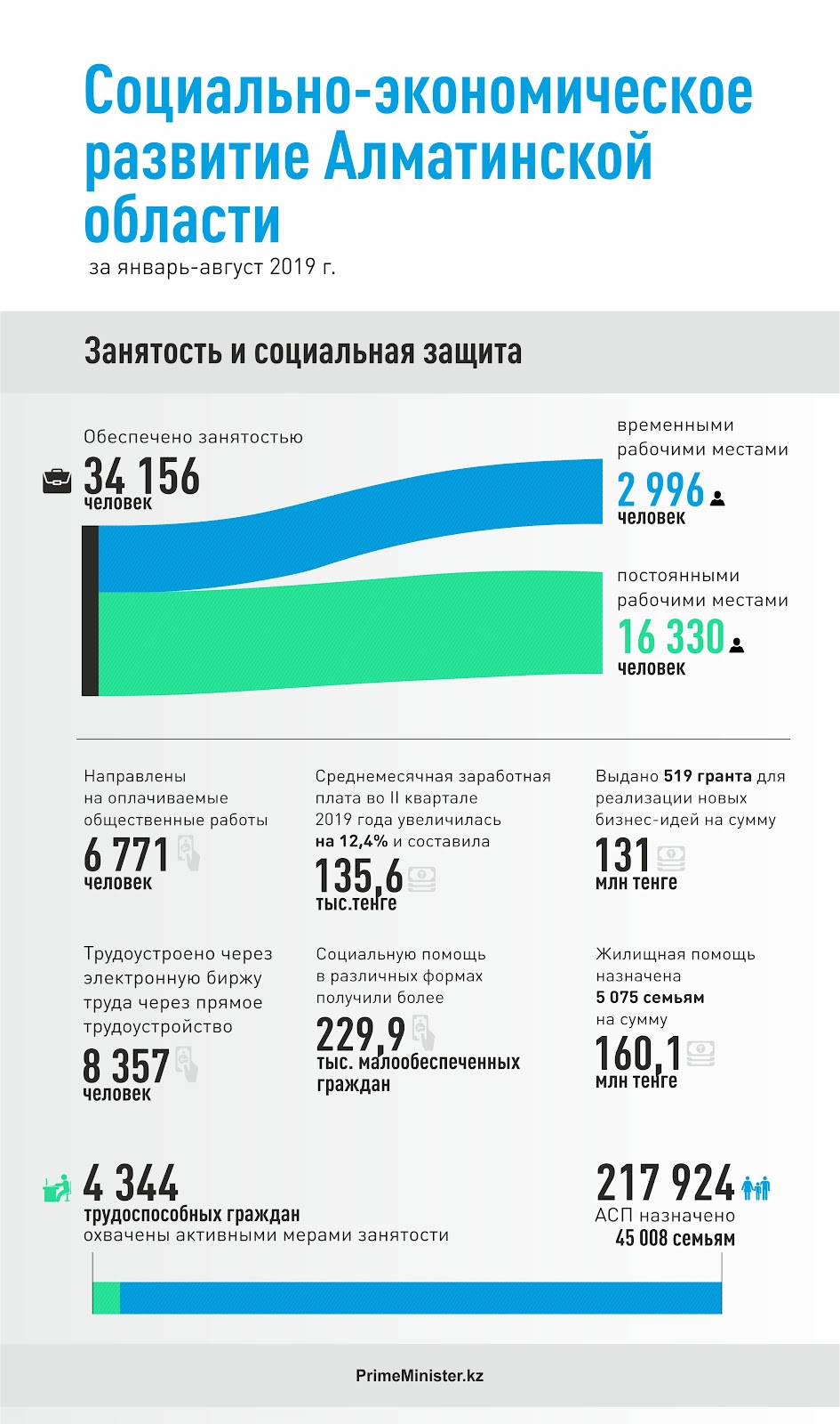 В 2019 году по Алматинской области Комплексным планом содействия занятости населения запланировано охватить более 50 тыс. человек. С начала года активными мерами занятости охвачены 70,9%.