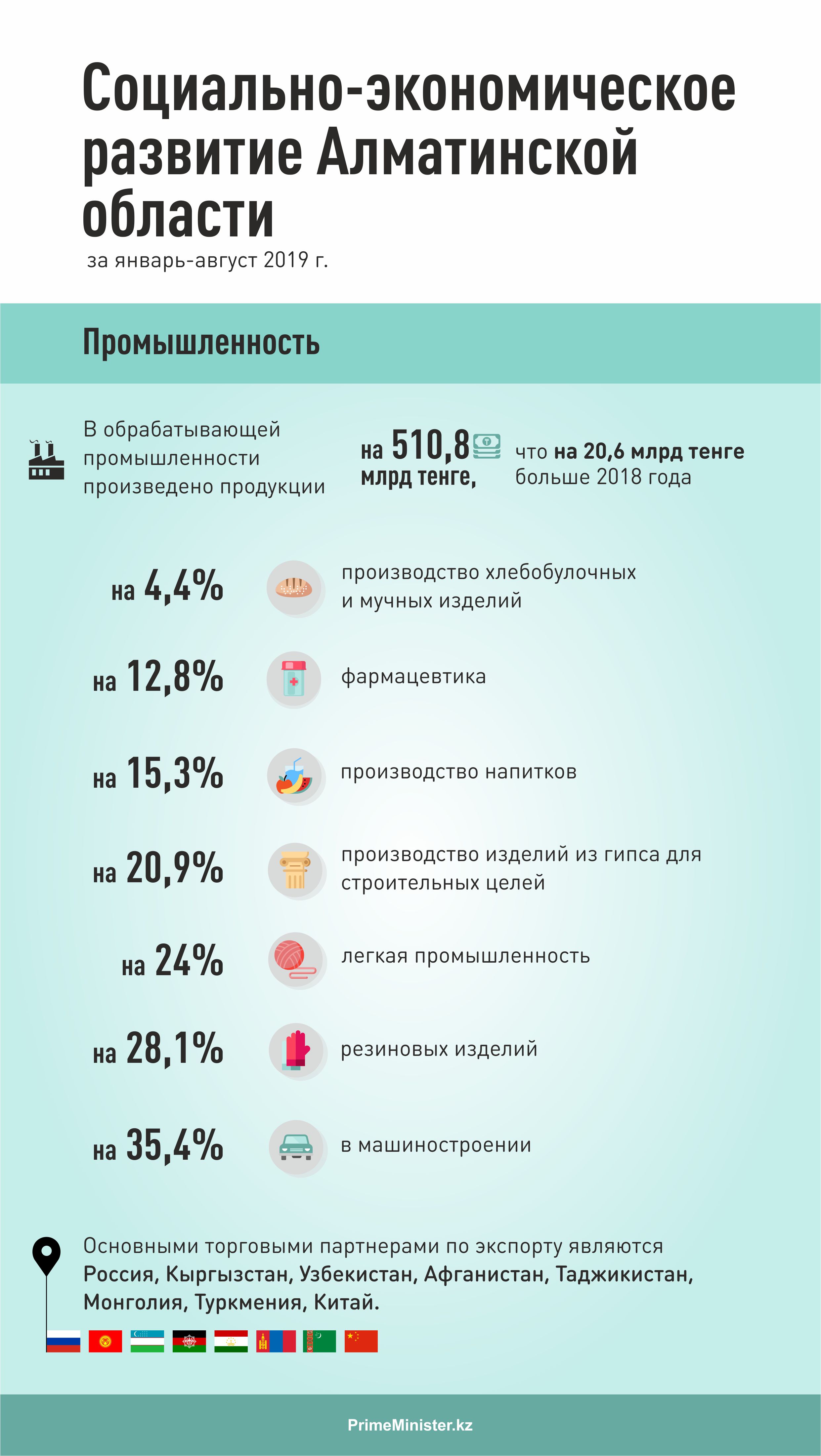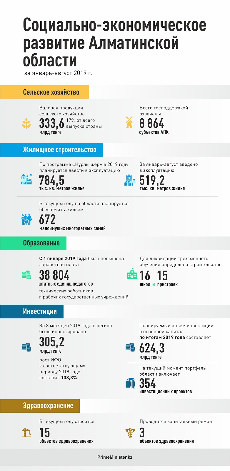 Сильные регионы — сильная страна. Именно так звучит один из разделов Послания Главы государства К.К. Токаева народу Казахстана от 2 сентября 2019 г. «Конструктивный общественный диалог – основа стабильности и процветания Казахстана». Президент страны поручил Правительству в срок реализовать комплекс мер, направленных на социально-экономическое развитие регионов. В частности на повышение доступности жилья, модернизацию инфраструктуры, рост доходов и улучшение качества жизни населения. О том, как развивается Алматинская область — в материале PrimeMinister.kz.