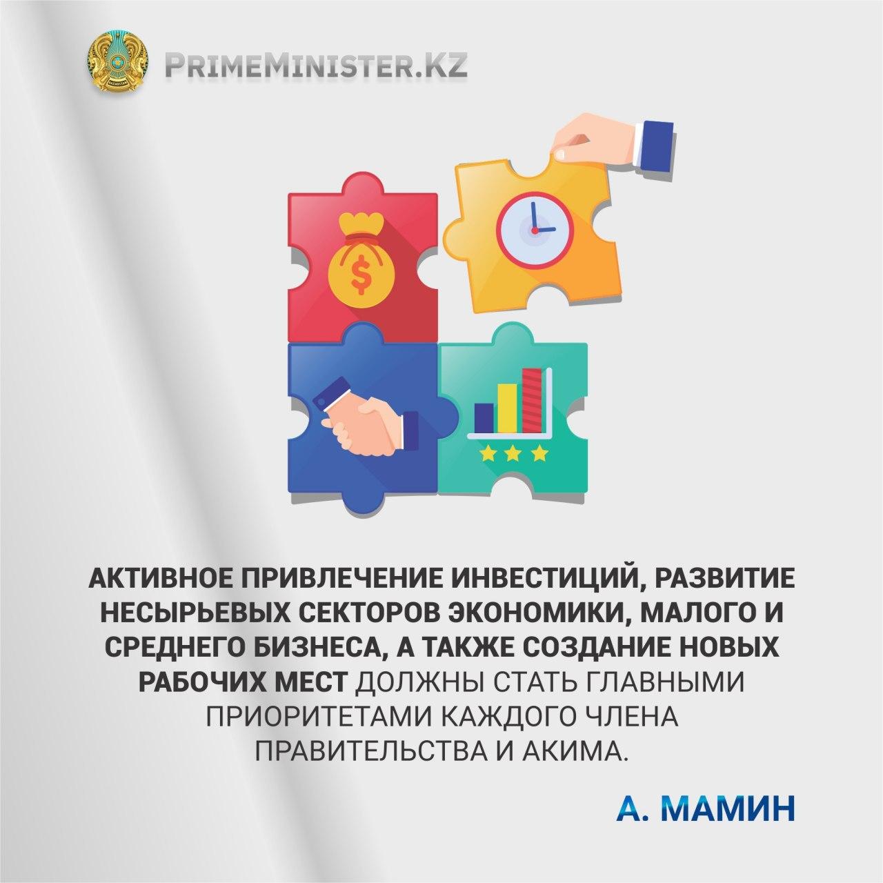 Аскар Мамин отметил, что данные поручения направлены на достижение поставленных Елбасы стратегических целей по повышению реальных доходов и качества жизни казахстанцев.
