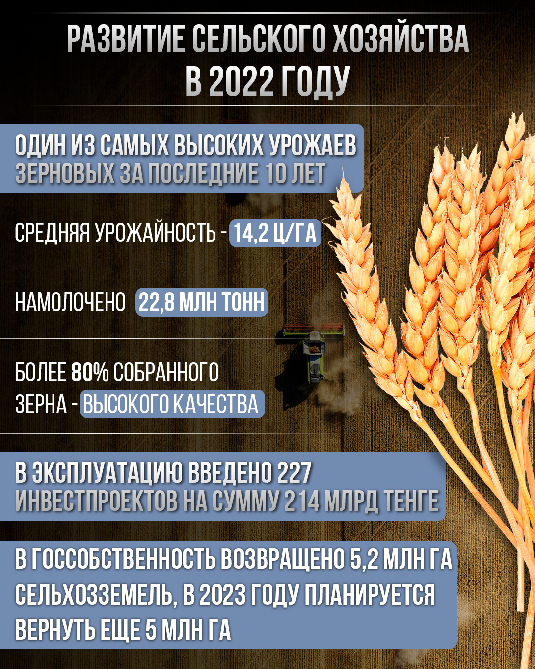 В 2022 году благодаря господдержке в эксплуатацию введено 227 инвестпроектов на сумму 214 млрд тенге, а до конца года их количество планируется довести до 237. В госсобственность возвращено 5,2 млн га сельхозземель, в 2023 году планируется вернуть еще 5 млн га. Была также продолжена реализация Комплексного плана по строительству и модернизации овощехранилищ, в рамках которого за 2021-2022 годы введено 201,1 тыс. тонн хранения (111% от плана).