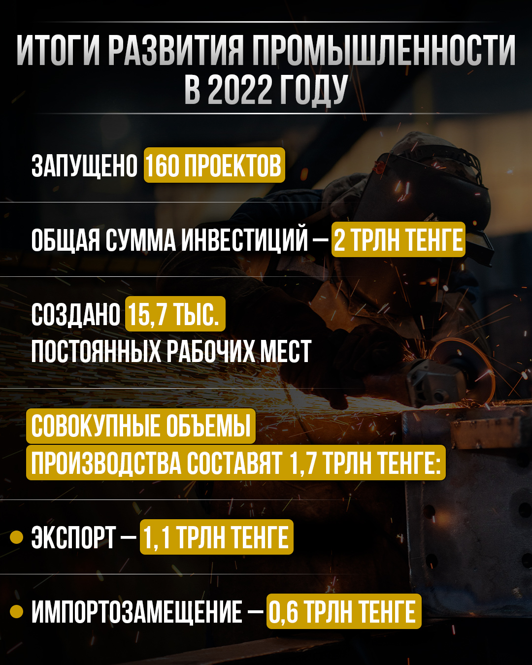 В целом при выходе на проектную мощность всех новых проектов 2022 года их совокупные объемы производства составят около 1,7 трлн тенге, из них экспорт – 1,1 трлн тенге, импортозамещение – 0,6 трлн тенге.