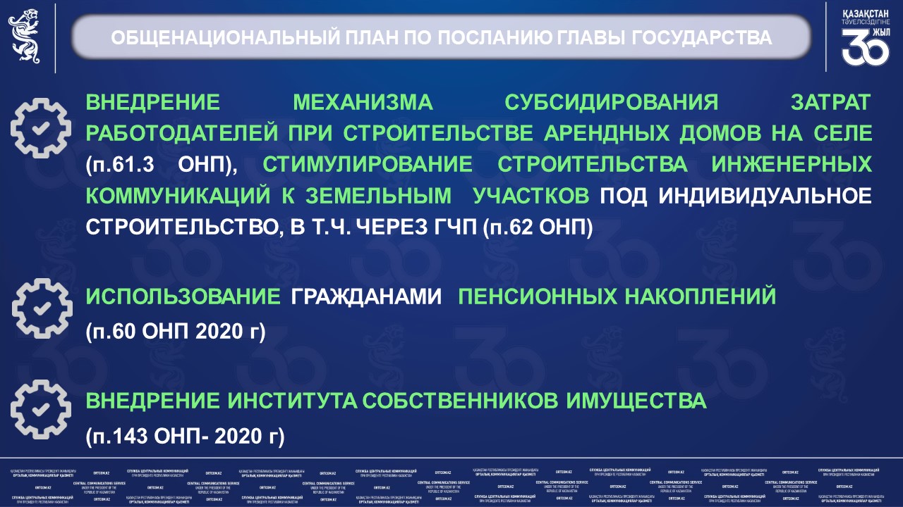 В рамках данных поручений выработан механизм субсидирования затрат работодателя при строительстве жилья на селе для своих работников и обеспечение до 2025 года включительно строительство инженерных коммуникаций к 110 тыс. земельным участкам под индивидуальную застройку (ежегодно 22 тыс. зем. участков).