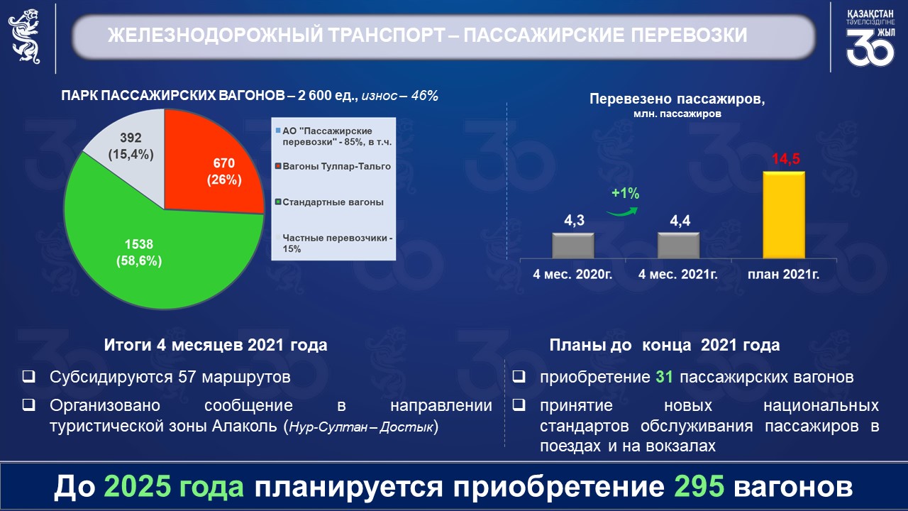 В 2020 году в рамках механизма государственной поддержки национальным перевозчиком приобретено 100 вагонов отечественного производства завода «Тулпар» на 40 млрд тг.