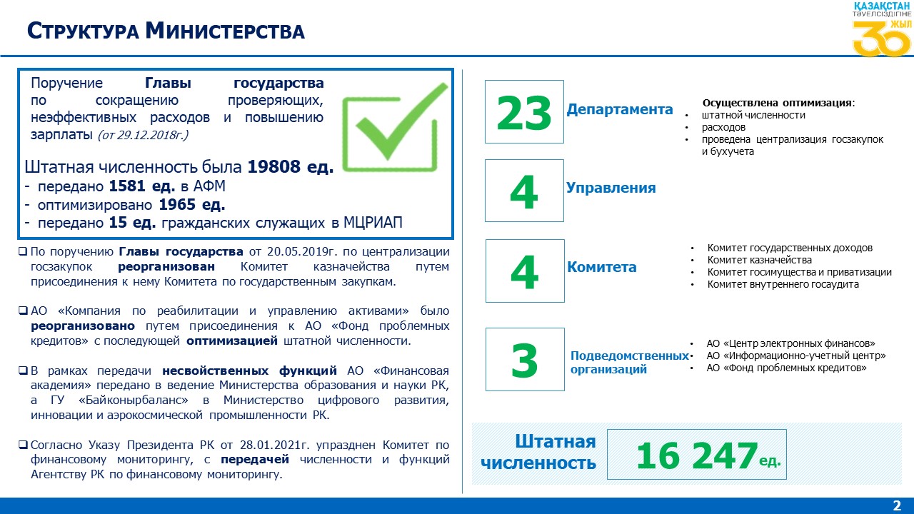 Сейчас штатная численность Министерства финансов составляет 16 247 единиц. За последние два года министерством проведена большая оптимизация. Сокращено 1 965 единиц. На сегодняшний день структура министерства состоит из центрального аппарата, 4 ведомств и 3 подведомственных организации.