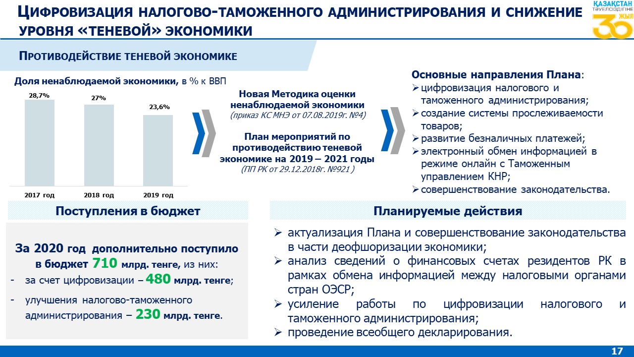 «Наша приоритетная задача снижение теневой экономики до уровня стран ОЭСР. Это – 15% к ВВП. Сейчас ведется работа по актуализации Плана мероприятий по противодействию теневой экономике по всем сферам и отраслям. Нами проводится усиленная работа по цифровизации налогово-таможенного администрирования, позволяющая обеспечить бюджет стабильными источниками доходов. Только за последние 3 года принятые меры обеспечили дополнительные поступления в бюджет в размере более 2 трлн тг, из них в 2020 году — 710 млрд тг. Снижению теневой экономики также способствует всеобщее декларирование доходов населения. Как вы знаете, с 1 января 2021 года стартовал первый этап всеобщего налогового декларирования», — сказал министр.