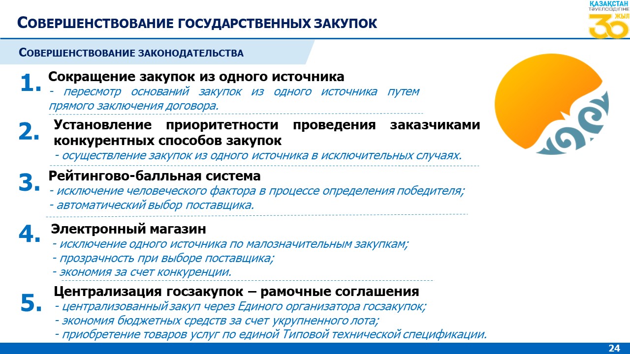 Также, законопроектом планируется запустить электронный магазин, который позволит приобретать товары на конкурентной основе за 1 день. Предусматривается возможность заключения Рамочных соглашений, направленных на сокращение сроков проведения конкурсных процедур до 5 рабочих дней.