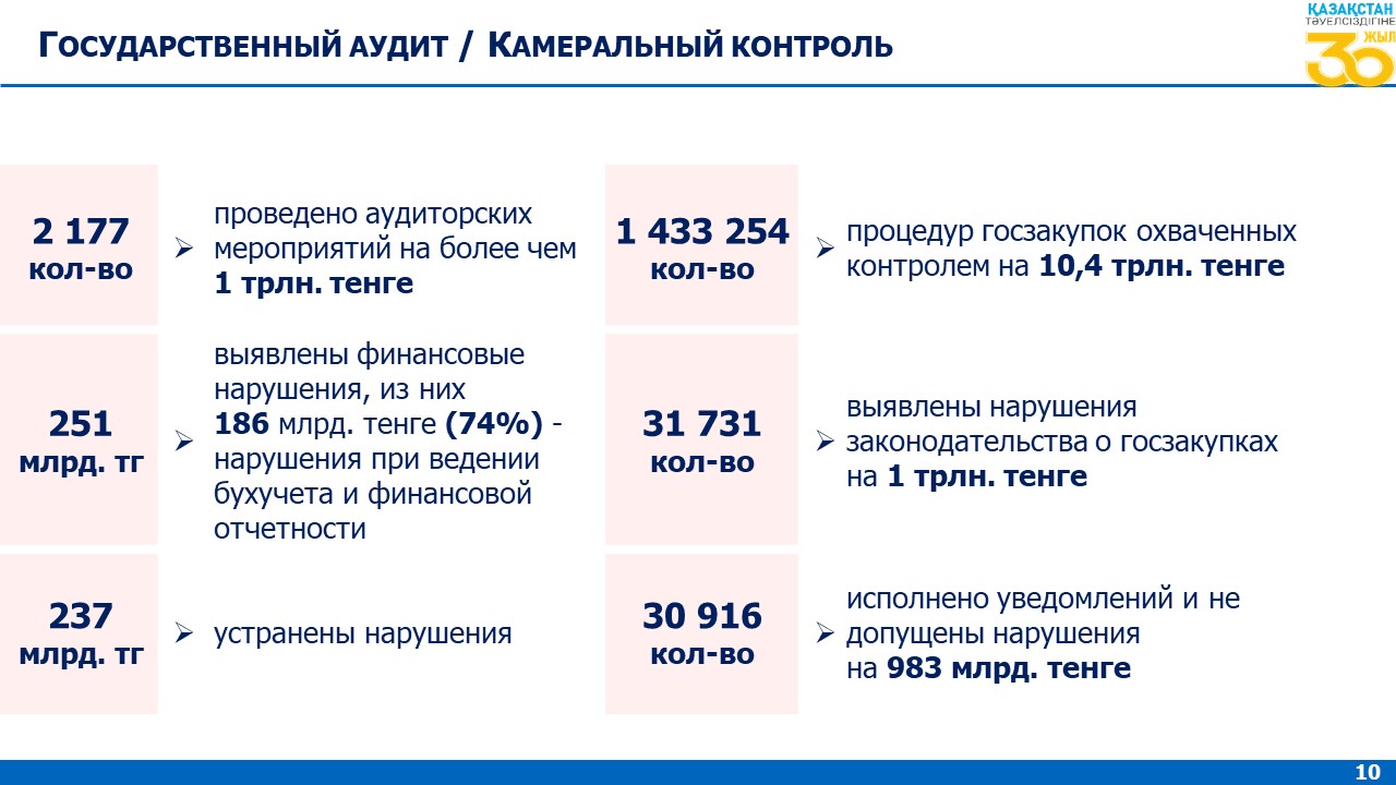 В 2020 году камеральным контролем охвачено более 1,4 млн процедур государственных закупок на 10,4 трлн тг. По итогам выявлены нарушения на 983 млрд тг, финансовые нарушения выявлены на 251 млрд тг, из которых 74% приходятся на нарушения при ведении бухгалтерского учета и финансовой отчетности. 251 материал направлен в правоохранительные органы, а за допущенные нарушения к ответственности привлечены 2 349 должностных лиц. Для повышения эффективности деятельности объектов аудита выданы 1 950 рекомендаций.