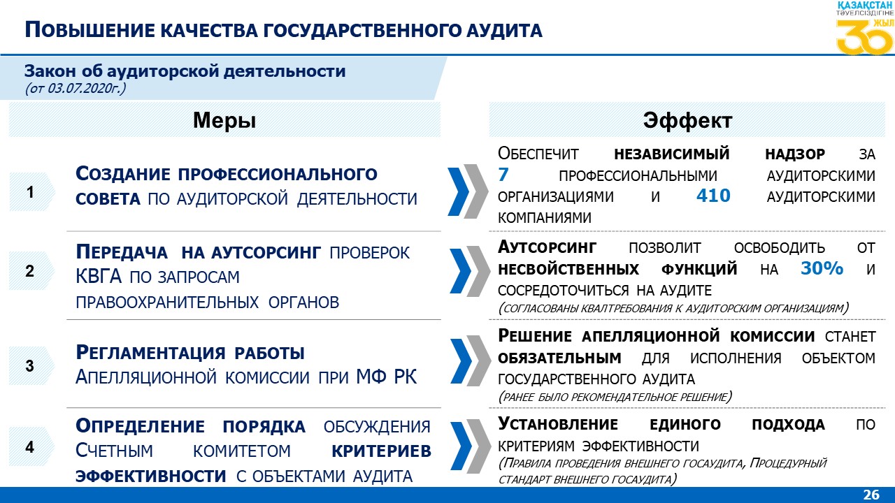 Предусмотрено создание профессионального совета по аудиторской деятельности. Это позволит скоординировать вопросы контроля качества и квалификационных экзаменов в сфере аудита в Казахстане.