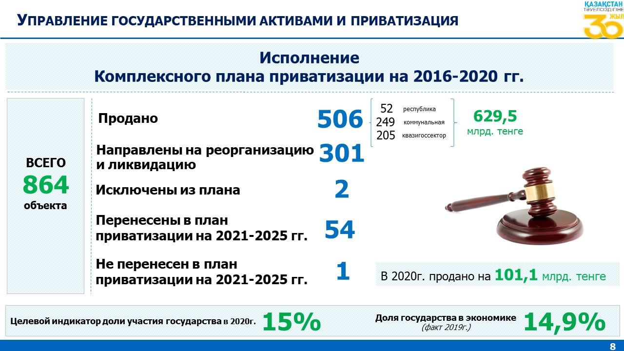 В 2020 году завершен комплексный план приватизации на 2016-2020 годы. В прошлом году продано 12 объектов на 101,1 млрд тг. В результате доля государства в экономике за 2015-2020 годы сократилась с 19,1% до 15% по отношению к валовому внутреннему продукту. В целях упрощения и ускорения процедур приватизации приняты соответствующие законодательные акты.