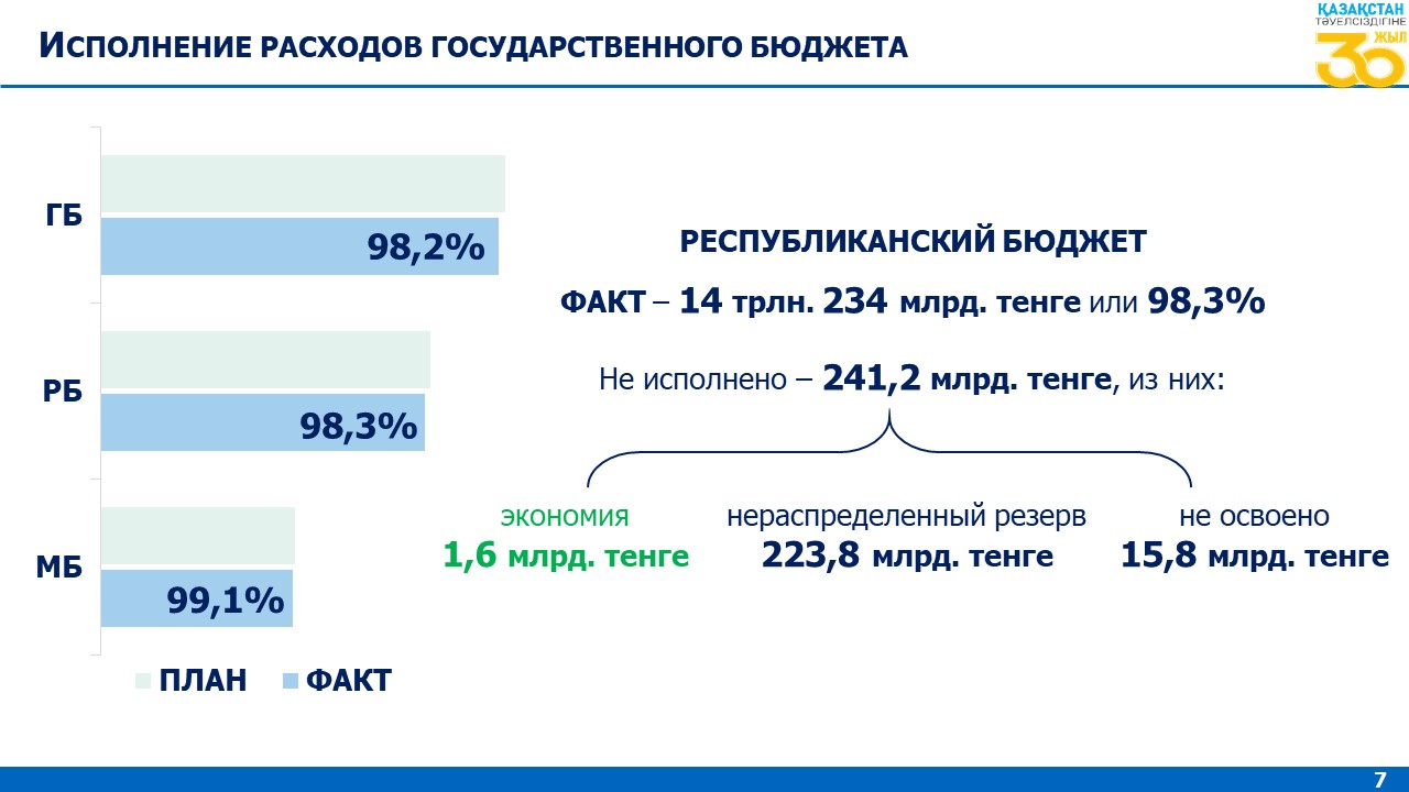 Расходы государственного бюджета исполнены на 98,2%, расходы республиканского бюджета — на 98,3%, расходы местных бюджетов — на 99,1%.