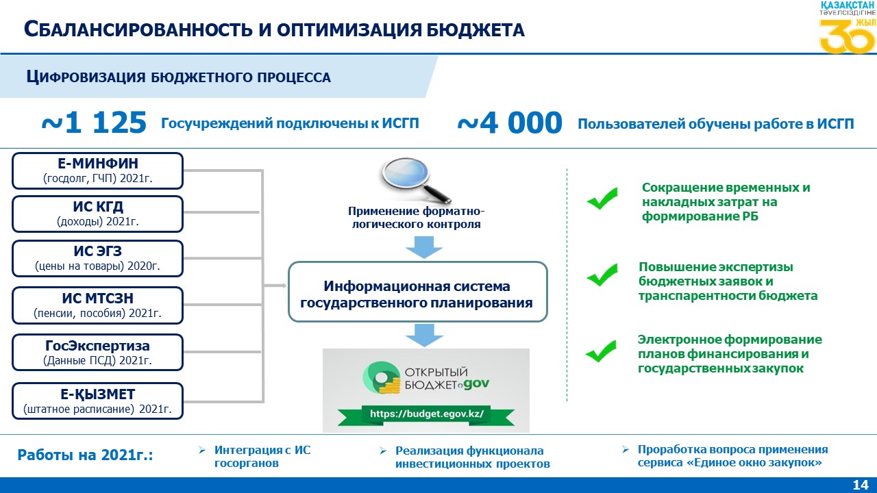 Вместе с тем, в 2020 году завершился 1-ый этап реализации проекта «Развитие системы государственного планирования», что позволило провести формирование республиканского бюджета на 2021-2023 годы в электронном виде.