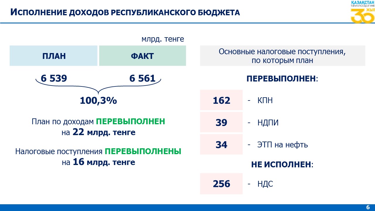 В прошлом году в республиканский бюджет поступило 6 трлн 561 млрд тг, план выполнен на 100,3%.
