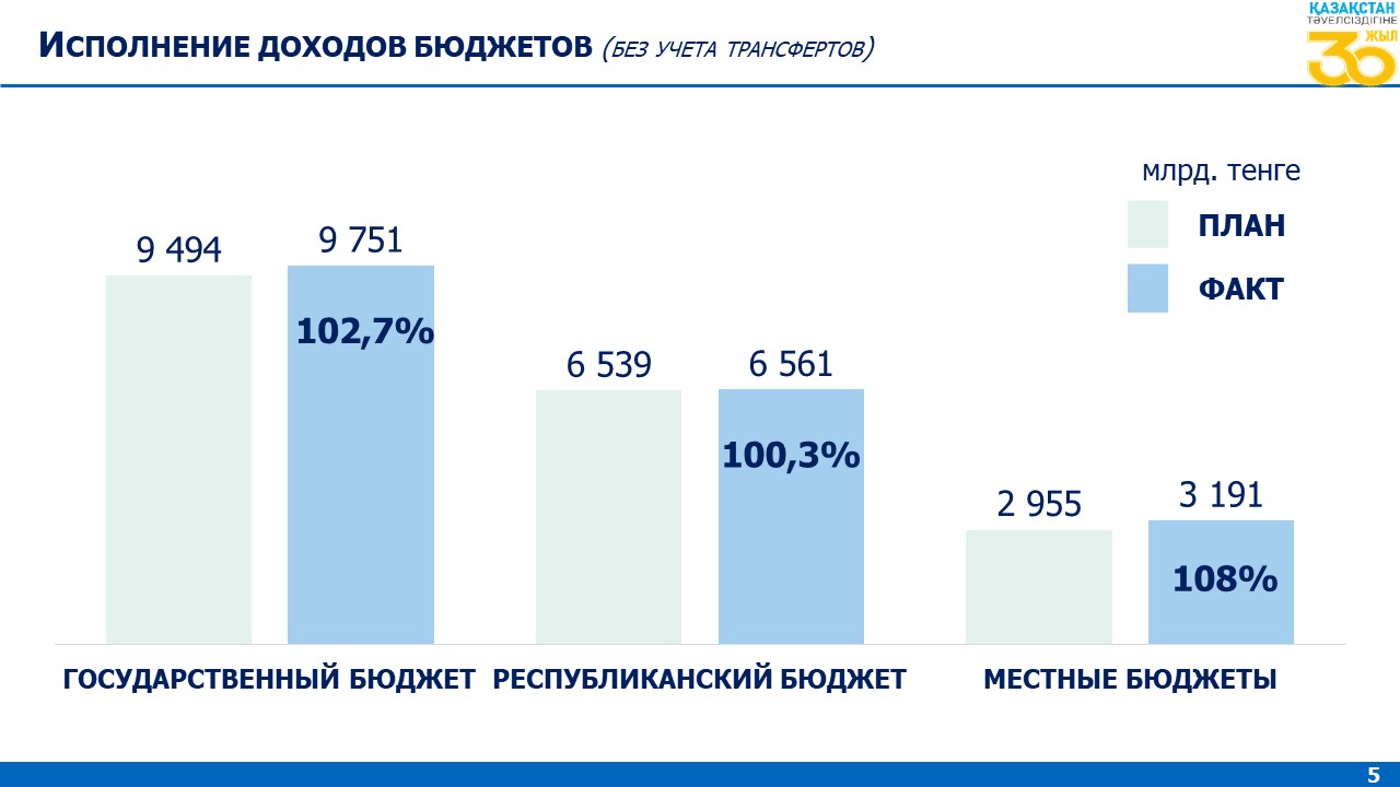 В прошлом году в госбюджет поступило 9 трлн 751 млрд тг, план выполнен на 102,7%. По доходам местных бюджетов план выполнен на 108%, при запланированных 2 трлн 955 млрд тг поступили 3 трлн 191 млрд тг.