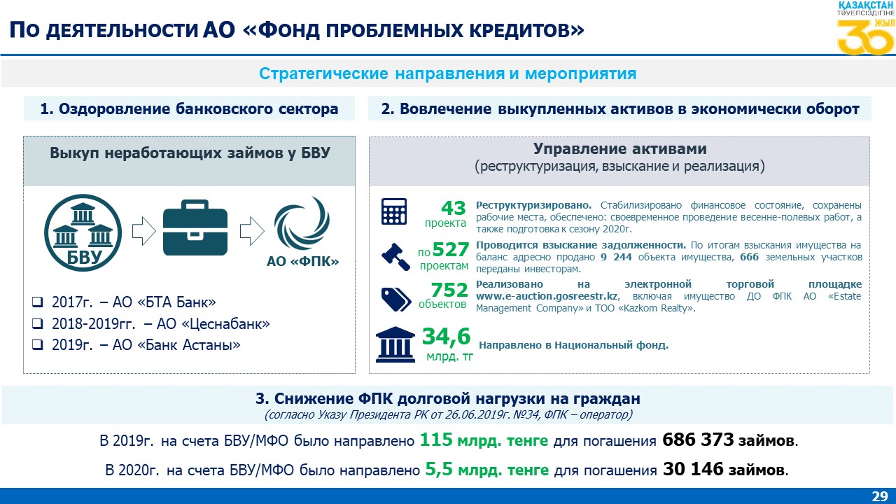 Это оздоровление банковского сектора и вовлечение приобретенных активов в экономический оборот. Для оздоровления проблемных активов и вовлечения компаний-должников в экономический оборот реструктурирована задолженность 43 компаний-должников.