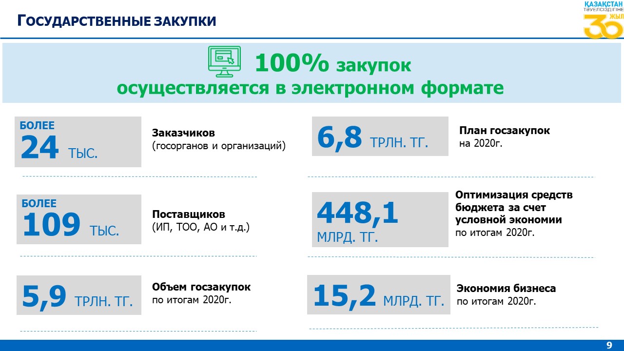 «Одной из важнейших составляющих исполнения бюджета являются государственные закупки. Сегодня весь его процесс автоматизирован. На веб-портале зарегистрировано более 109 тыс. поставщиков и 24 тыс. заказчиков. Объем госзакупок вырос на 30% по сравнению с 2019 годом и составил 5,9 трлн тг. В прошлом году условно сэкономленные при госзакупках средства составили 448 млрд тг. В целом за последние 3 года экономия составила 1 трлн тг», — отметил Е. Жамаубаев.