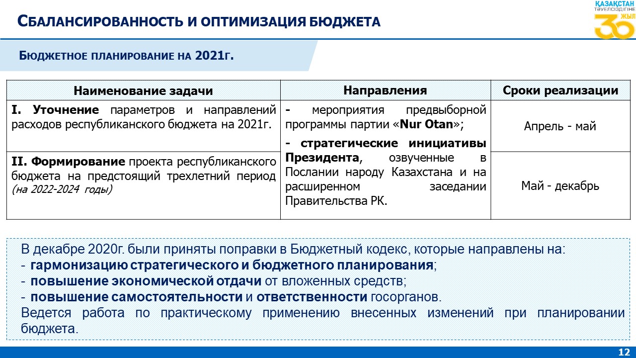 В соответствии с поправками определены лимиты расходов администраторов бюджетных программ с акцентом на стратегические задачи. Также совместно с госорганами ведется работа по подготовке национальных проектов в разных отраслях экономики.